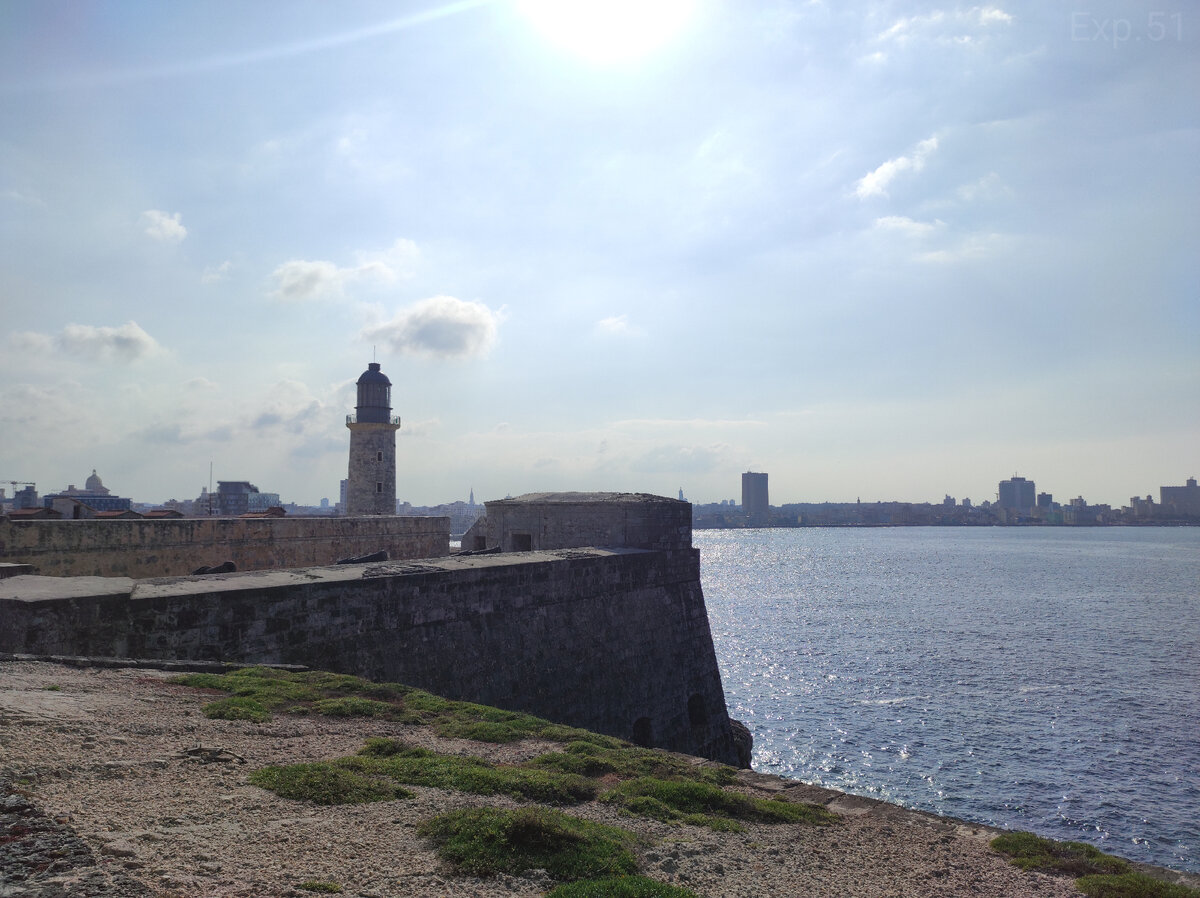 Вид с крепостной стены на Гавану. Слева расположен маяк.