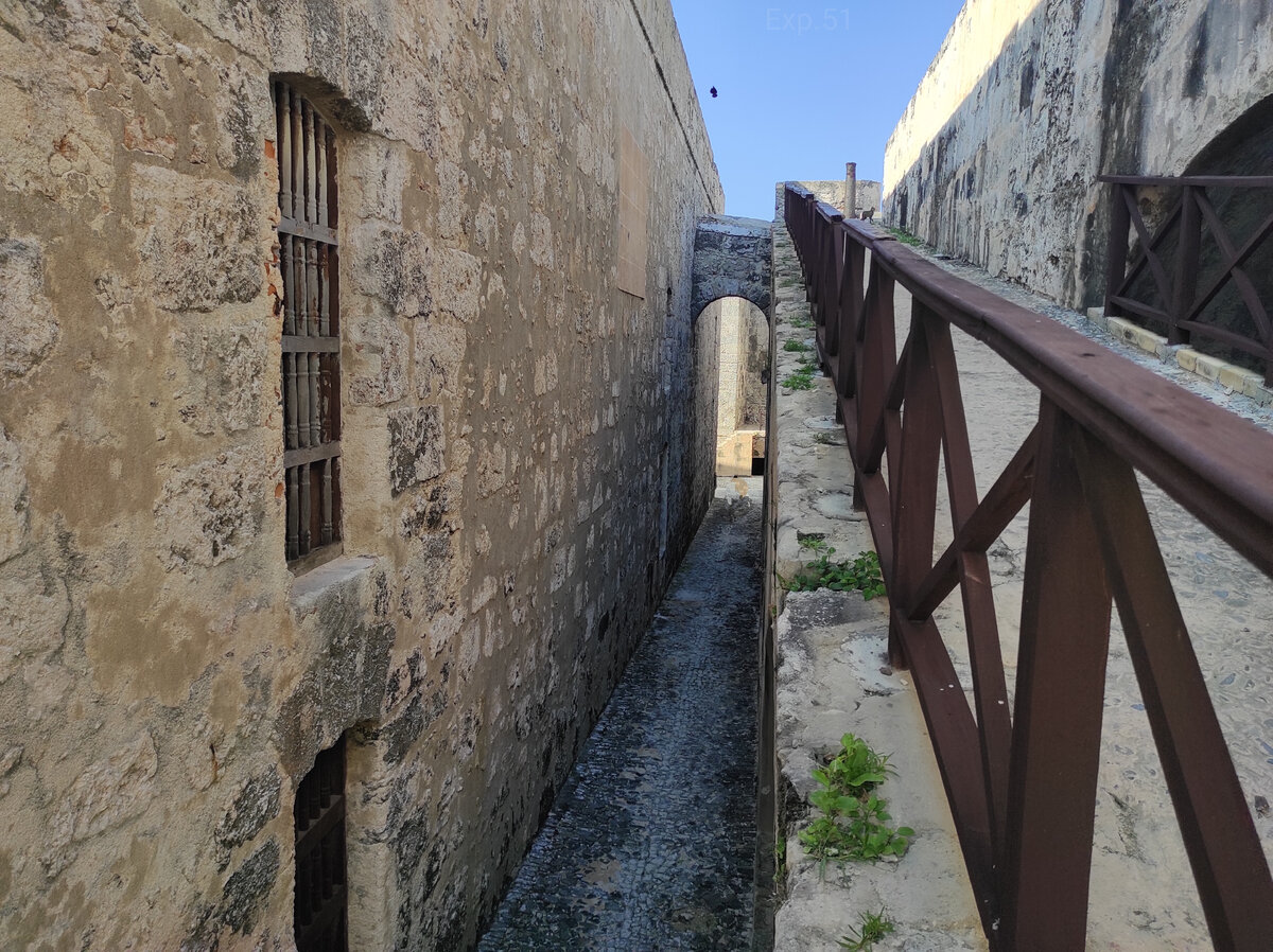 С главного входа можно оценить высоту стен, которые почти 200 лет оставались неприступными. В дальнем конце расположены бойницы для ведения огня вдоль рва.