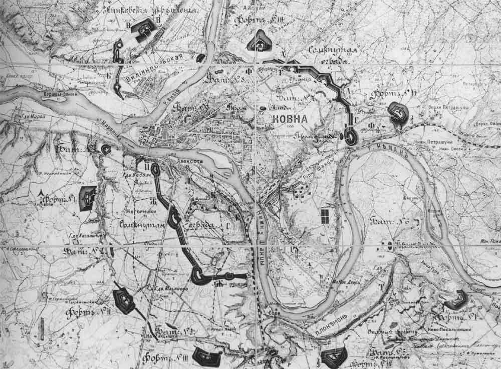 Расположенная при впадении реки Вилии в Неман, она прикрывала стратегический железнодорожный узел Санкт-Петербург–Варшава и переправы через Неман, уязвимость которых проявилась ещё в 1812 году. Ковенская крепость была комплексом из девяти фортов (I–IX), образующих кольцо радиусом 8-10 км вокруг Ковно, с батареями, люнетами и казематами. Гарнизон насчитывал 66 629 человек, поддерживаемых 1370 орудиями (57–203 мм), включая 350 тяжёлых. Крупные форты (I–III, старейшие) имели бетонные своды толщиной 2–3 м и рвы от 6 до 8 м. VIII форт выделялся инновациями. Там были электричество, канализация, принудительная вентиляция и телеграф.