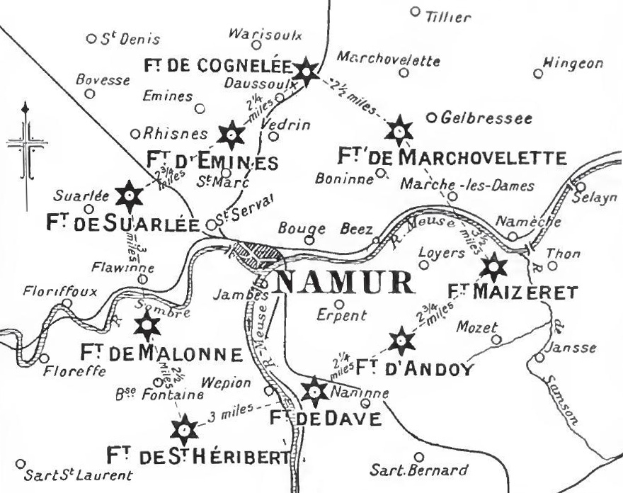 Намюр считался одним из ключевых узлов обороны Бельгии, прикрывая стратегические переправы и пути вглубь страны. Крепость состояла из девяти фортов, образующих кольцо радиусом 7 км вокруг города: шесть крупных и три малых. Проект создавался как ответ на угрозу немецкого вторжения, особенно после Франко-прусской войны 1870 года, когда Германия показала свою мощь. Каждый крупный форт содержал гарнизон из примерно 500 человек и от 8 до 12 орудий. Малые форты имели гарнизон примерно 80–100 человек и от 4 до 6 орудий. Бетонные своды толщиной 2–2,5 м защищали от 210-мм снарядов, но не от 420-мм «Большой Берты» или 305-мм гаубиц Skoda. Фортификационная сеть включала рвы, пулемётные казематы и подземные галереи, но вентиляция была слабой: дым от выстрелов и взрывов скапливался внутри, деморализуя гарнизон. Общий гарнизон Намюра насчитывал около 37 000 человек, поддерживаемых 300 орудиями, включая полевые батареи.