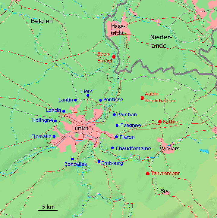 Льеж считался ключевым бастионом, прикрывающим переправы через Маас и пути вглубь Бельгии, что делало его первой целью немецкого плана Шлиффена в 1914 году. Крепость состояла из 12 фортов, образующих кольцо радиусом 6–10 км вокруг города. Крупные форты (например, Лонсен или Понтисс) имели гарнизон около 500 человек и от 8 до12 орудий, в том числе 120-мм и 210-мм гаубицы. Бетонные своды толщиной 2–2,5 м защищали от от огня широко используемой в то время артиллерии. Основная часть форта находилась под землёй, на поверхности виднелась лишь насыпь с броневыми башнями, откуда вёлся артиллерийский огонь. Общий гарнизон Льежа насчитывал около 40 000 человек.