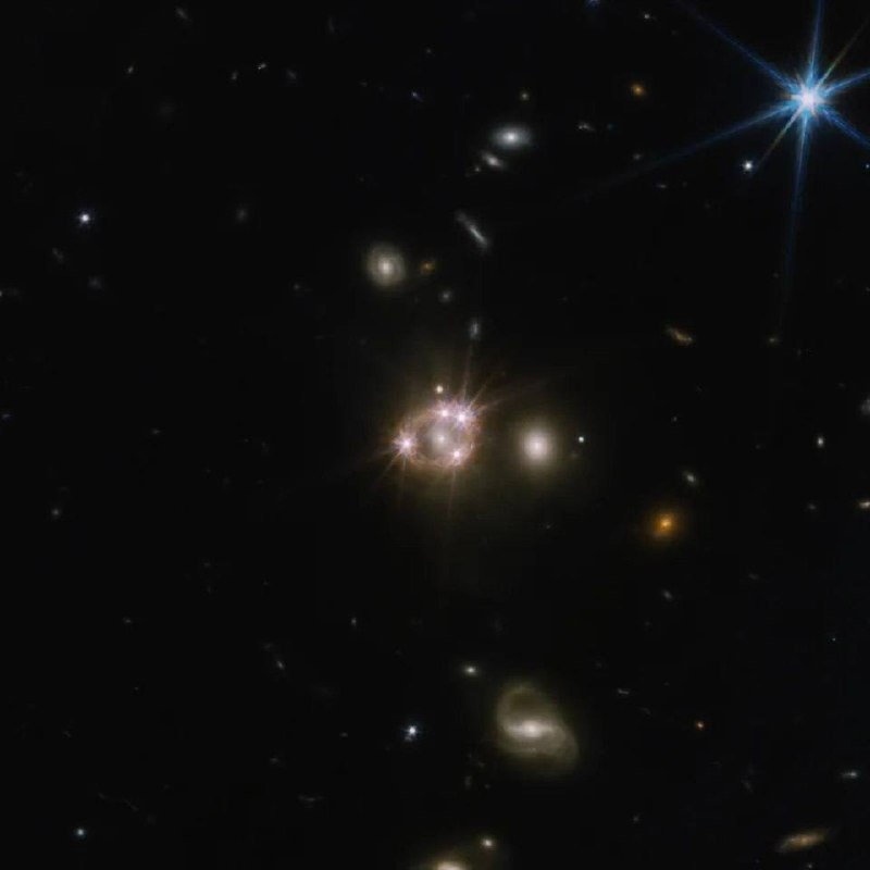 В центре фотографии мы видим квазар WFI J2033-4723. Каждая из четырех точек — это один и тот же квазар. Это возможно благодаря массивной галактике на переднем плане, которая учетверяет изображение далекого квазара. Явление было предсказано Альбертом Эйнштейном врамках работы над общей теорией относительности.