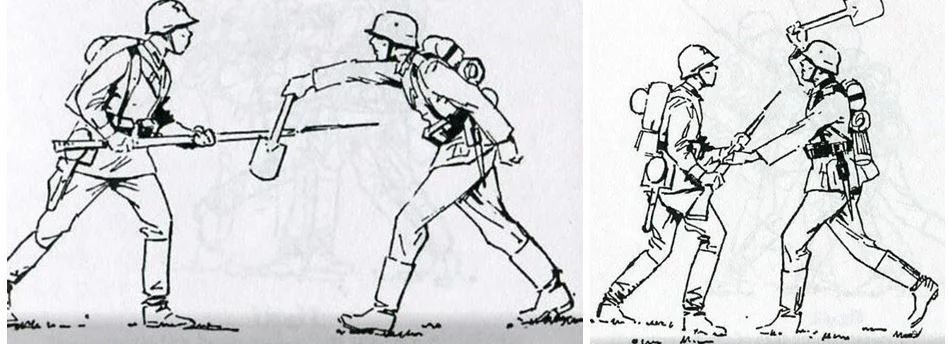 Боец армагеддонского Стального Легиона демонстрирует солдату из вальхальского моторизованного полка приёмы ведения боя с помощью лопаты.