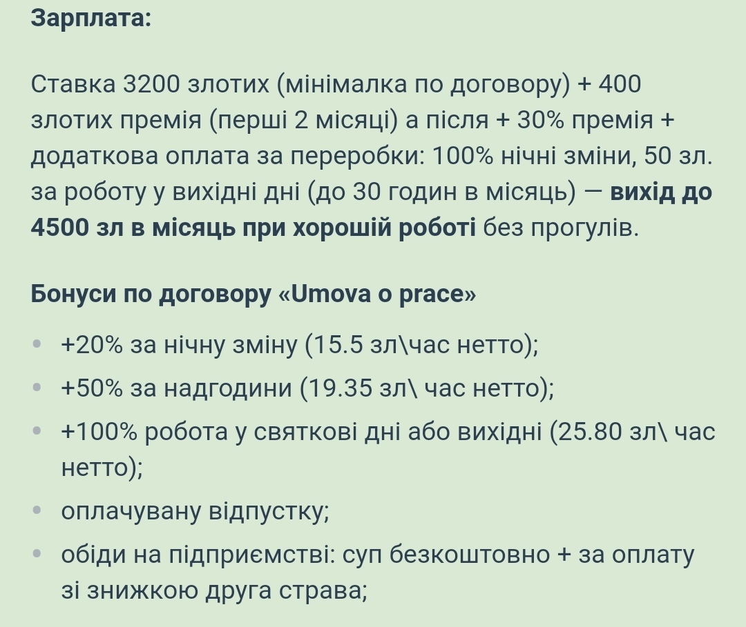 Ставка от 17 злотых чистыми, бесплатное жилье , бесплатное все для человека который без специальности, опыта и языка - это только если нелегально или полулегально , или на лохотронах типа уа контракт .( это если простой разнорабочий на предприятие )