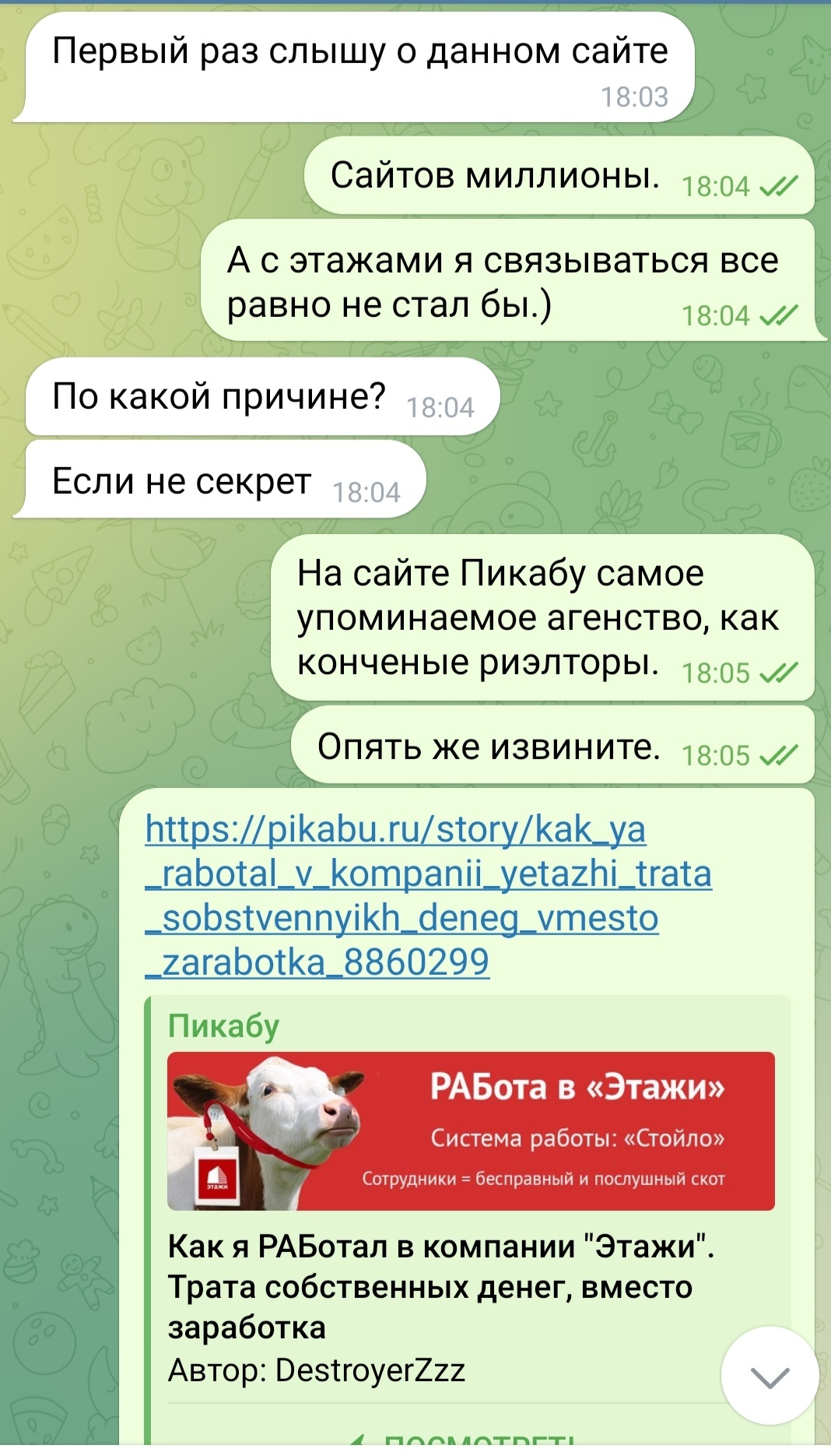 Ustasmm Крик души риэлтора из "Этажи" 1 год назад Сдаю комнату в Санкт-Петербурге. Естественно, пишут риэлторы. Спрашиваю, что вам нужно? Хотят сами жить. Посылаю их...."в другое место". Про Пикабу она не слышала. Прочитав отзывы на Пикабу о ее компании выдала крик души. Верить, нет?) [моё] Риэлтор Недвижимость Длиннопост 1 Ещё 0