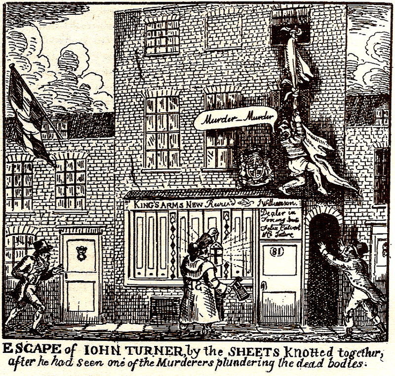Таверна «Королевский герб» закрывалась ровно в одиннадцать часов вечера, но были и исключения. Таким исключением и был друг Джона Уильямсона констебль Андерсон. В тот поздний вечер констебль Андерсон решил попить пивка. Уже после закрытия таверны, он зашёл в таверну за пивом. В таверне никого не было, кроме жильцов дома: Джона Уильямсона и его жены, их внучки Китти, служанки Бриджет Хэррингтон и их жильца Джона Тернера. Все они были живы и здоровы. Пока Элизабет Уильямсон наливала пива, её муж пожаловался на неизвестного в коричневой куртке, который в последнее время ошивался у таверны и казался странным, будто что-то разведывал. Констебль Андерсон пообещал неизвестного сразу же арестовать, как только увидит. Констебль Андерсон вернулся к себе домой, а пиво ему обещали принести домой. Бриджет Хэррингтон отнесла пиво в дом констебля и вернулась в таверну. Андерсон выпил пиво примерно за двадцать минут. Решив ещё выпить пивка, он вышел на улицу, как сразу услышал крики, что произошло убийство. Андерсон увидел, что из окна дома Уильямсонов цепляясь за связанные между собой простыни, спускался абсолютно голый мужчина, и кричал что-то нечленораздельное. Это был Джон Тернер. Когда он упал на мостовую, то продолжал плакать и что-то бормотать.