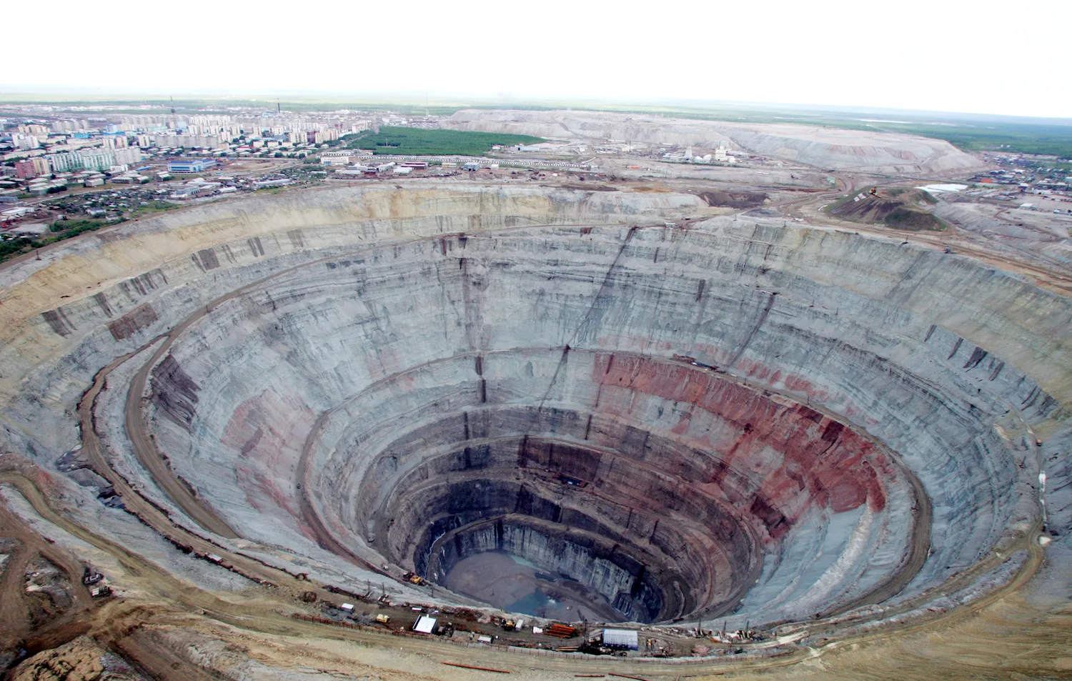Поначалу копали открытым способом, методично снимая слои земли один за другим. По мере углубления пришлось переходить на подземный метод добычи. Карьер разросся до размеров натуральной воронки апокалипсиса: 735 метров вглубь и 1,4 километра в диаметре. По своим масштабам это одна из самых грандиозных ям на планете. Условия работы были, мягко говоря, адовыми: вечная мерзлота требовала применения динамита, чтобы прогрызть тоннели сквозь толщу льда и камня. Несмотря на суровый климат, уже в 60-х отсюда ежегодно вывозили по 2 килограмма алмазов, из которых 20% шли ювелирам, а остальные 80% на нужды промышленности. Открытую добычу свернули в июне 2001 года, а с 2009-го начали полноценно юзать подземный рудник "Мир", строительство которого шло с начала нулевых. Проектная мощность составляла миллион тонн руды в год.