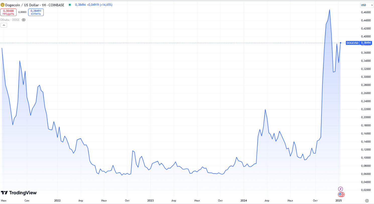 Правда, ничего серьёзного он за неё так и не продаёт. Хотя вновь обещает. В итоге доги периодически растёт, потом падает, потом растёт вновь.