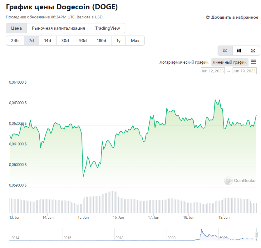 Вечером 19 июня Dogecoin торговался по $ 0,06191, потеряв за сутки 0,36% и 15,65% за предыдущие 30 дней. Недельная динамика была в плюсе на 0,93%.