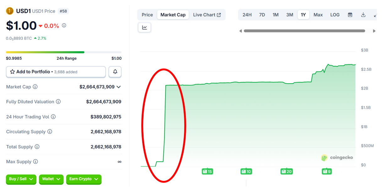 График капитализации стейблкоина USD1 от World Liberty: обратите внимание, как в него буквально за пару дней в конце апреля залили $2 млрд – в тот момент, когда им вообще практически никто еще не пользовался