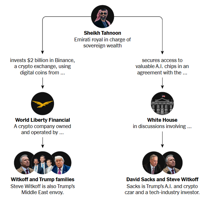 Шейх Тахнун левой рукой засылает миллиарды баксов криптокомпании семей Трамп/Уиткофф, а правой рукой с этими же ребятами договаривается о государственном одобрении поставок очень нужных ему чипов для AI. Красиво!