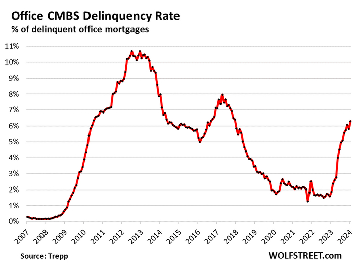 Уровень просрочки по офисным ипотечным кредитам, которые были секьюритизированы в CMBS(коммерческие ценные бумаги с ипотечным покрытием), вырос до 6,3%, по сравнению с уровнем просрочки в 1,9% в январе 2023 года.