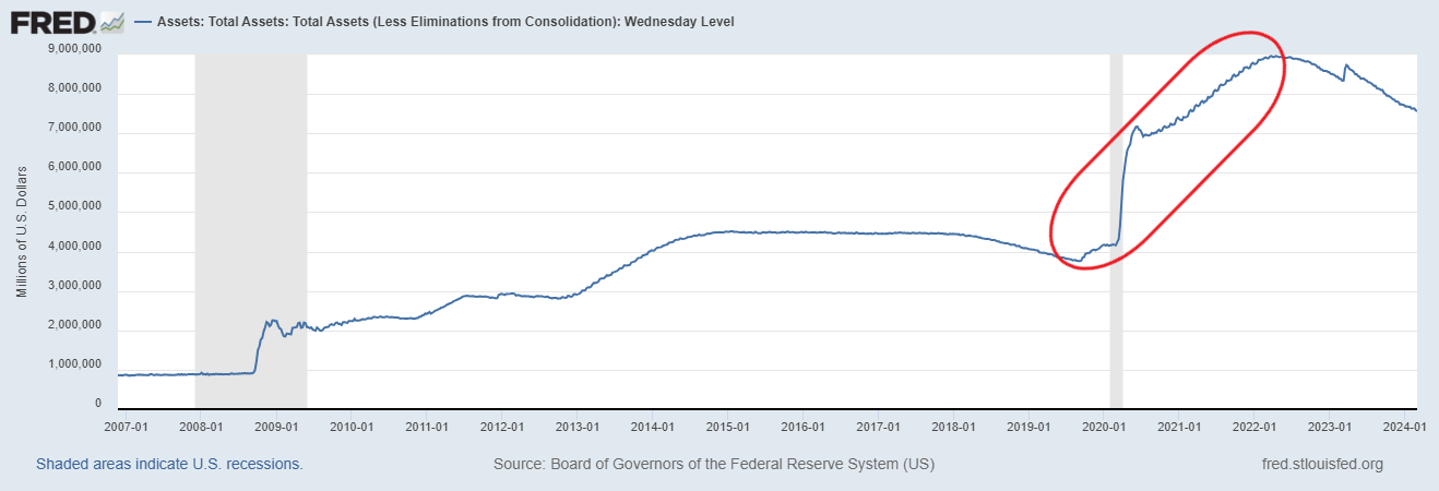 Нил Калланан из Bloomberg подчеркнул: "Крах коммерческой недвижимости(CRE), разворачивающийся в США, является естественным следствием количественного смягчения, который вытеснил инвесторов из более безопасных активов, таких как облигации, в альтернативные фонды, такие как частные инвестиции, торговые центры и склады". Количественного смягчения на 5 триллионов долларов, это больше чем за весь предыдущий период существования ФРС.