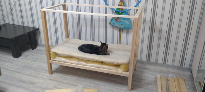 Крыша сделана уже из сосны для уменьшения веса. Покрыли кровать белым лаком и сшили чехол на крышу.