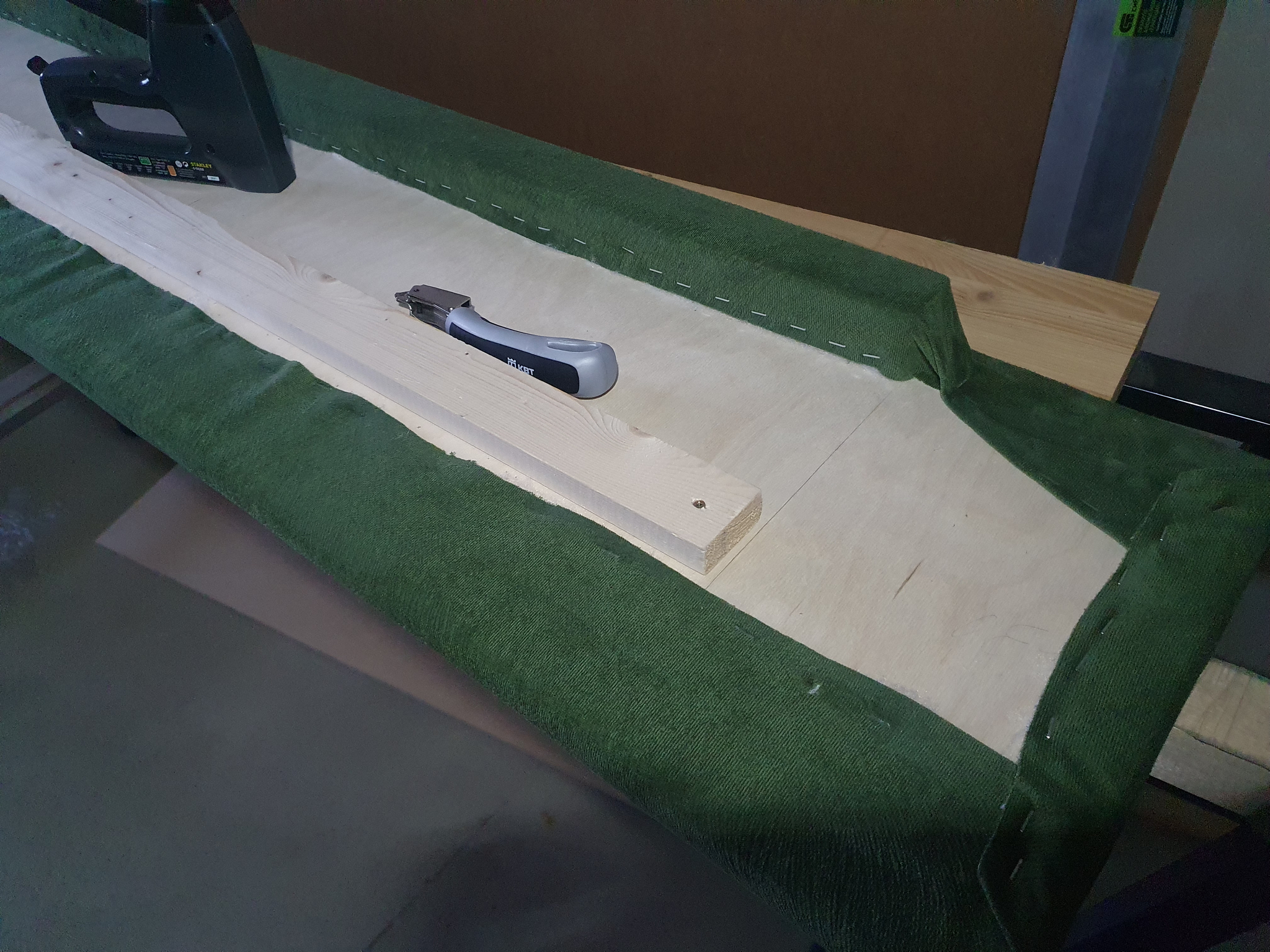Для прибивания выбрал 140 скобы, толстая спинка показалась более подходящей. Сложно собрать аккуратно ткань около брусьев, так как за ними сразу уголки крепятся.