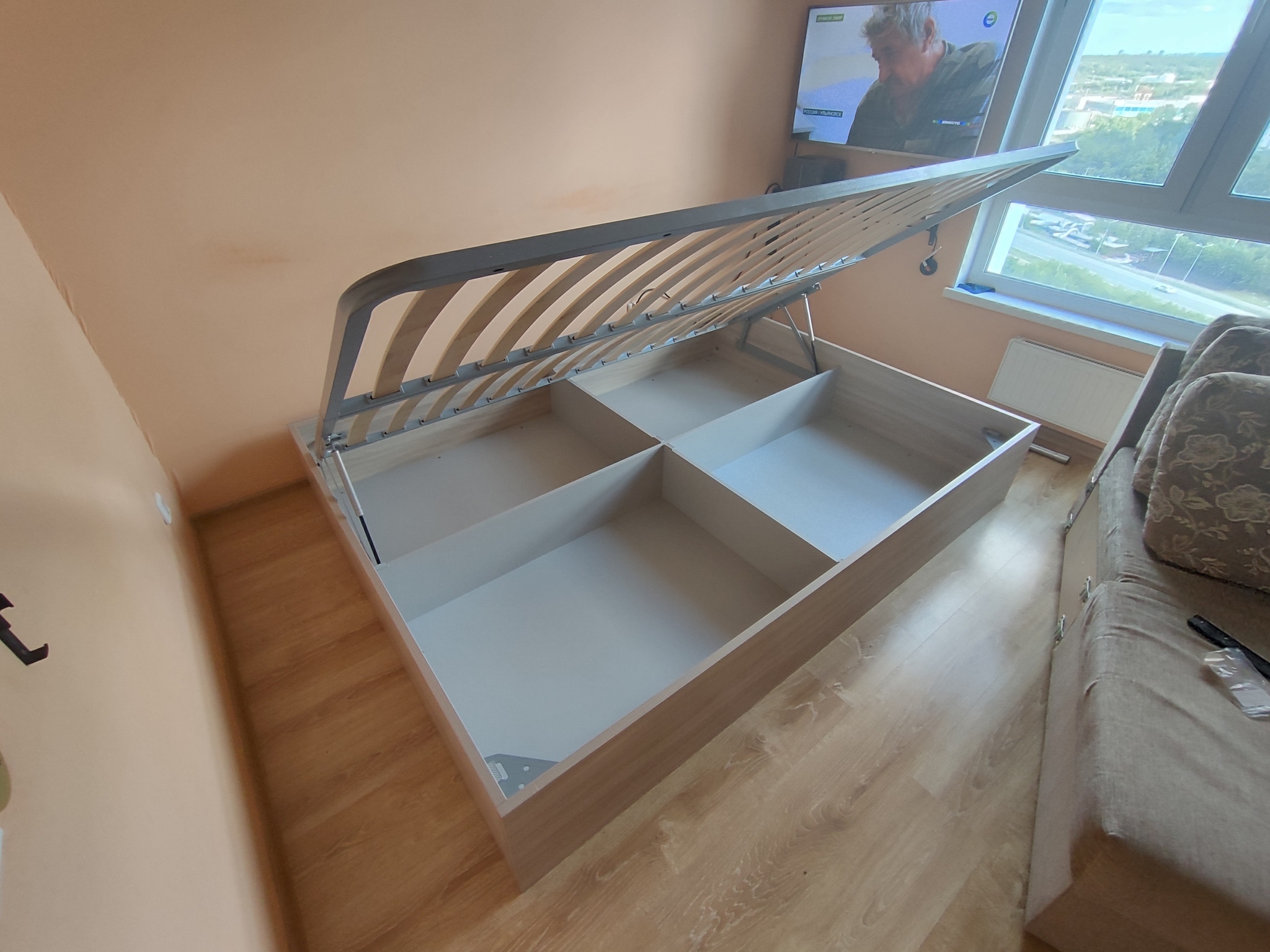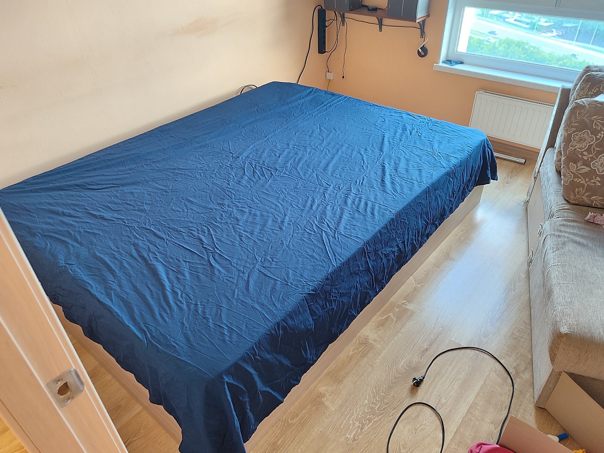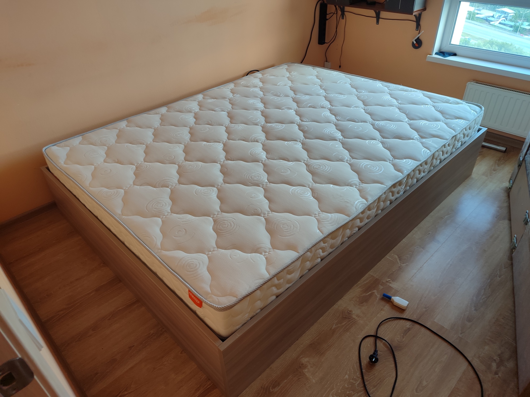 Решил маме кровать с хорошим матрасом подарить, чтобы спина не болела из-за старого раскладного дивана. В комнате лишнего места нет, нужно было уместить на место дивана. Места есть 217х127см, плюс нужно боковое открытие. В магазинах не нашлось подходящей кровати, решил делать сам. Отвёз маму смотреть матрасы, не видя цен, понравился полностью латексный, за 48т (+3т наматрасник). Заказал, купил фурнитуру (уголки, решётку и тд.).