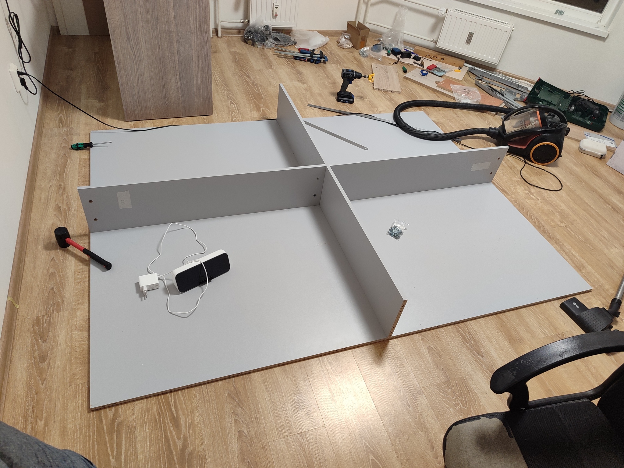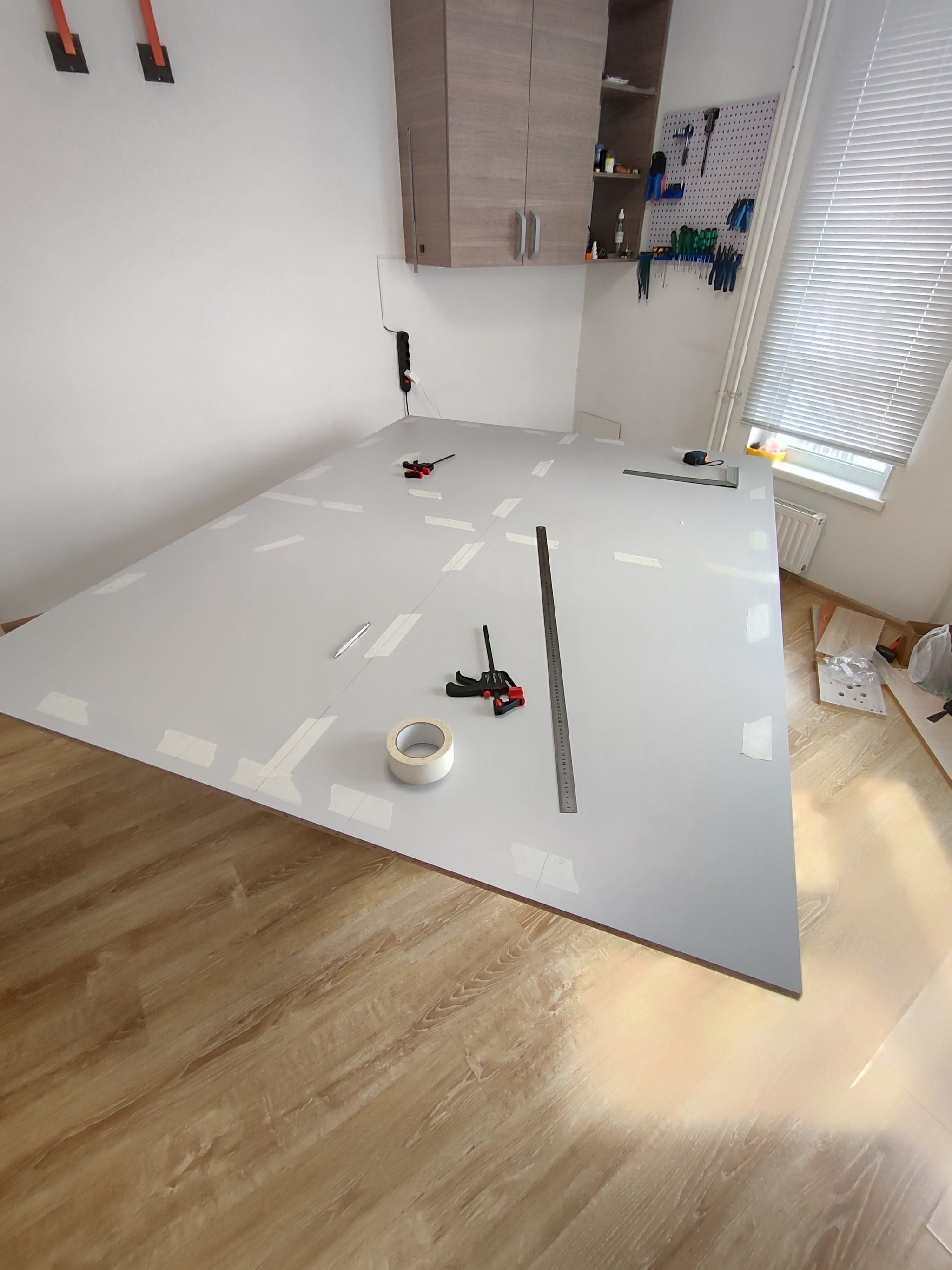 Долго думал над материалом кровати. Мебельный щит мог доставить проблем в работе (внезапные выгибания и тд, имел с ним дело) и достаточно дорог. Остановился на Фанере ФК 15мм. Из минусов — размеры только 1525х1525, так что длинные стороны пришлось делать составные из двух частей. Скреплял брусом 40х40 снизу и 20х45 посередине.