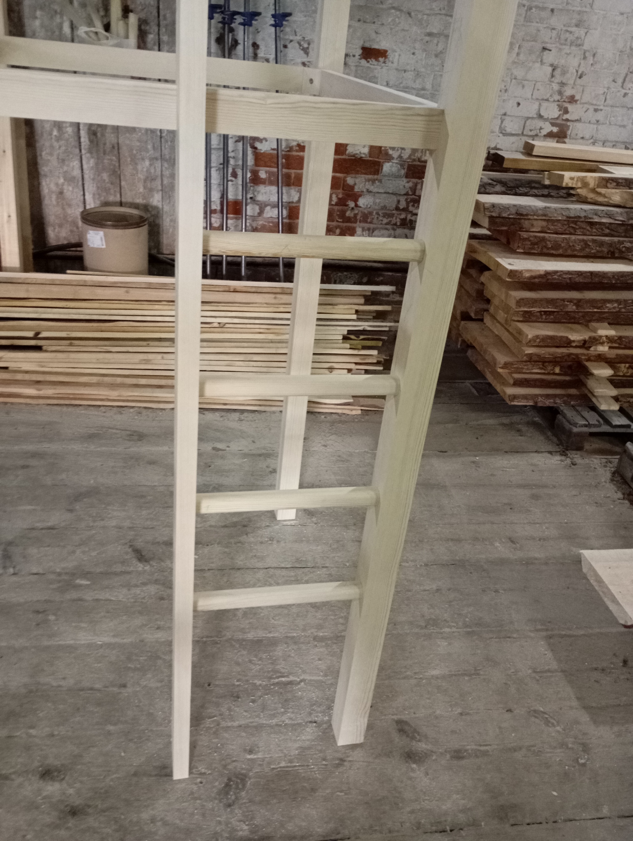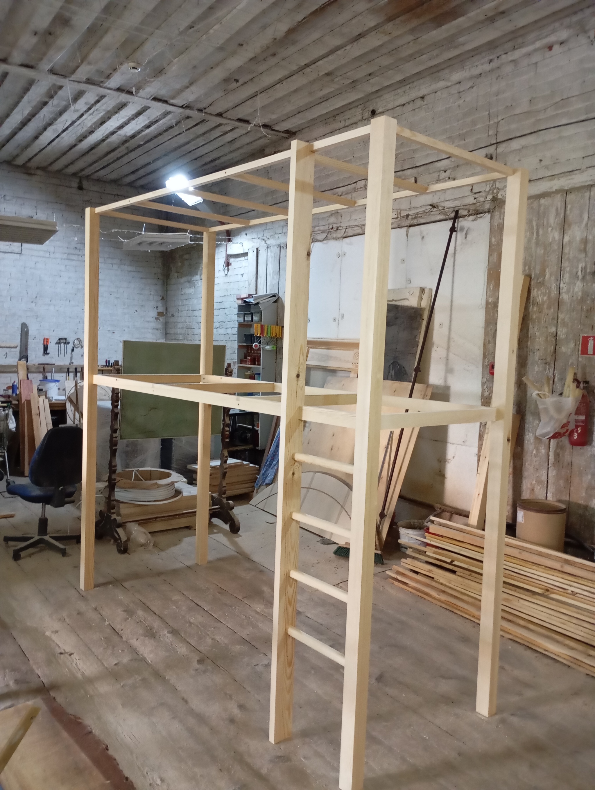 Детская игровая на втором ярусе. Сосна, размеры: высота 2610мм, длина в районе 2500, ширина 1000мм. Высота площадки 1500. Снизу будет диван, от которого плясали по размерам, сверху детская игровая зона. От нас попросили только каркас и лесенку, дальше заказчики сами обошьют площадку фанерой, потолок и царги крашеным мдф-ом и добавят плетëные ограждения.