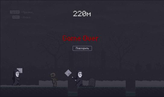 Изначально перещапуск был на любую клавишу, но от этой идеи отказались, так как игроки к предыдущему посту в комментариях писали, что не успевают посмотреть свой результат, так как постоянно жмут атаку или пробел. Поэтому теперь только на R.