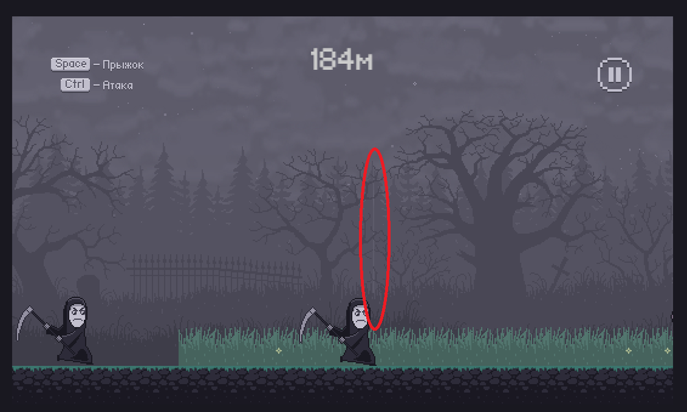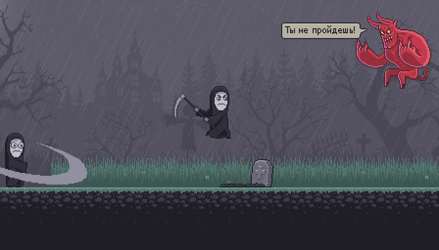 В игре есть препятствия, есть враги (Мишани ещё нет, но пасхальные яйца уже присутствуют). Враги задерживают косаря и не дают пройти дальше. Их можно перепрыгнуть или убить косой. Каждый раз игровой мир генерируется заново.