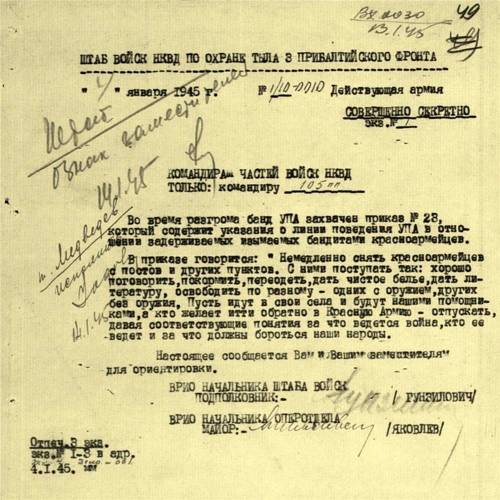 Во время разгромов банд УПА захвачен приказ №28, который содержит указания о линии поведения УПА в отношение задерживаемых изымаемых бандитами красноармейцев.
