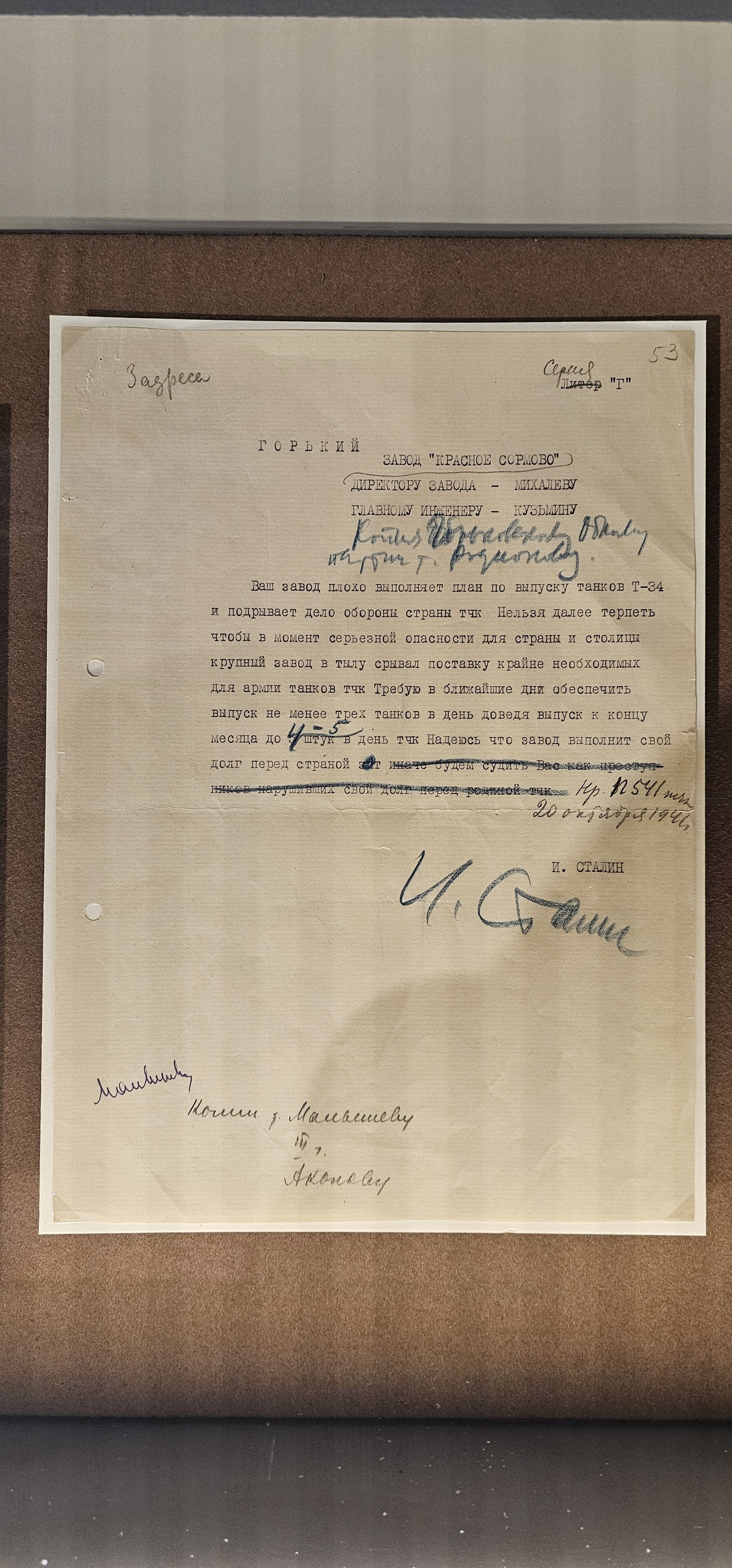 Давеча побывал на выставке "Без права на забвение" (к 80 - летию Победы, проходит в государственном историческом музее). Отметил для себя один документ, согласованный к отправке Сталиным. Показалось интересным, что Иосиф Виссарионович вычеркнул данный текст из подготовленной телеграммы. Пы. Сы. Выставку рекомендую