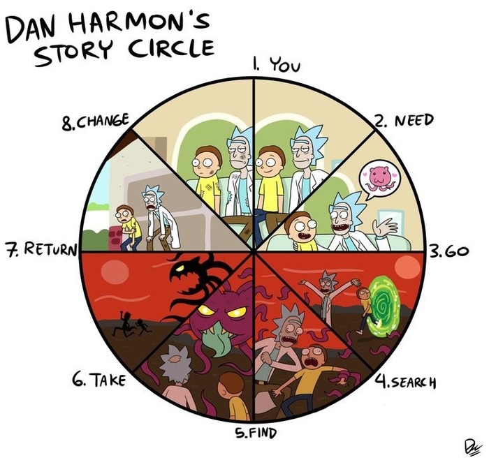 Дэн Хармон – один из двух основателей «Рика и Морти» (вместе с Джастином Ройландом), и он же – автор техники «Круг истории». В течение многих лет он был поглощен поиском единой структуры, и, в конце концов, вывел собственную теорию – на основе мономифа (также известного как «Путь героя») Джозефа Кэмпбэлла.