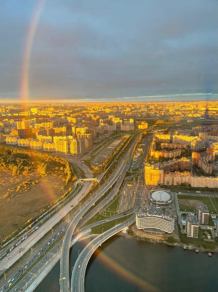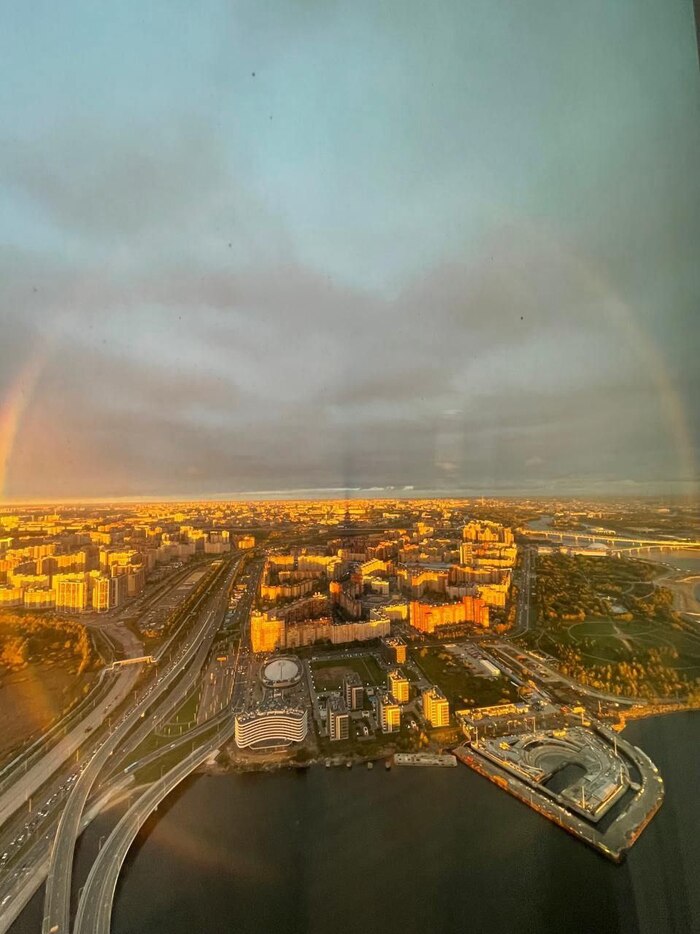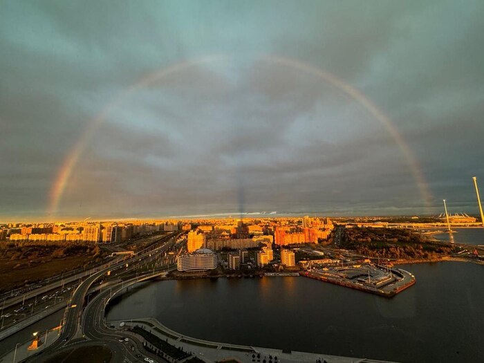 Истинную радугу демонстрируют кадры с верхушки «Лахта Центра» в Санкт-Петербурге. Там она соединяется в круг