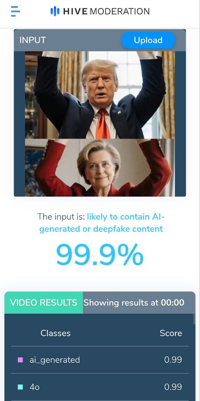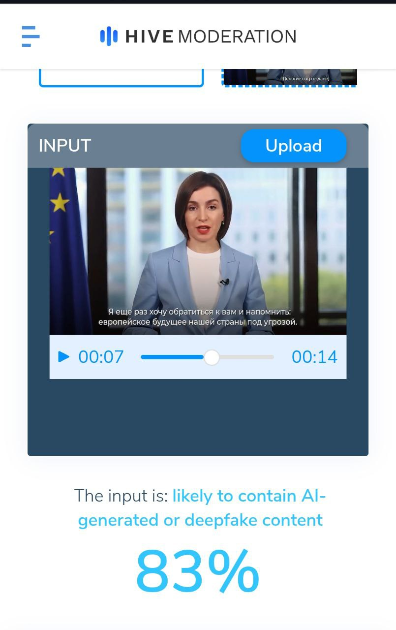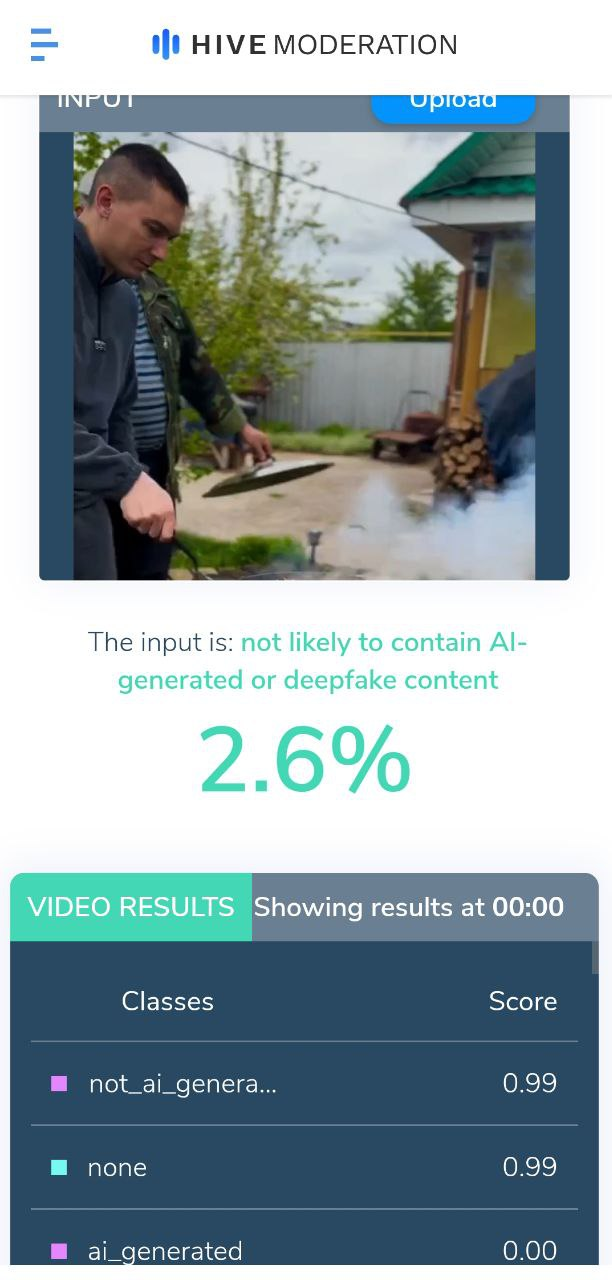 Например вот когда видео полностью сгенерировано как в каких-нибудь мемах, там будет 99%, когда частично фейк, но основанный на реальном там может быть меньше 99%, но больше 20%. У настоящего видео тоже может показать 1-10%. У меня через компьютер почему-то часто выдаёт ошибку, поэтому делаю через телефон, видео не больше 20 секунд должно быть.