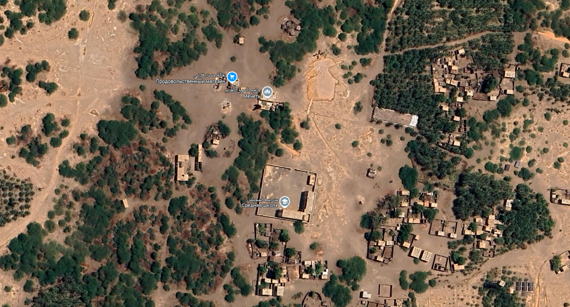 Если с пресной водой повезло, то возникает небольшое поселение. Часто на Гугл-картах у таких мест нет даже названий. Но вот тут даже инфраструктуру нанесли (магазин, мечеть и школа):