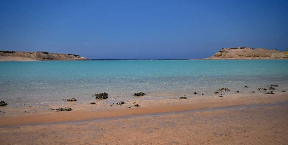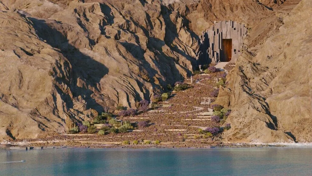 Чтобы проникнуться духом будущего, решено остановиться неподалеку от гигантской строительной площадки The Line. Там есть красивая лагуна с великолепной бирюзового цвета водой и романтичным названием "Пляж влюбленных":