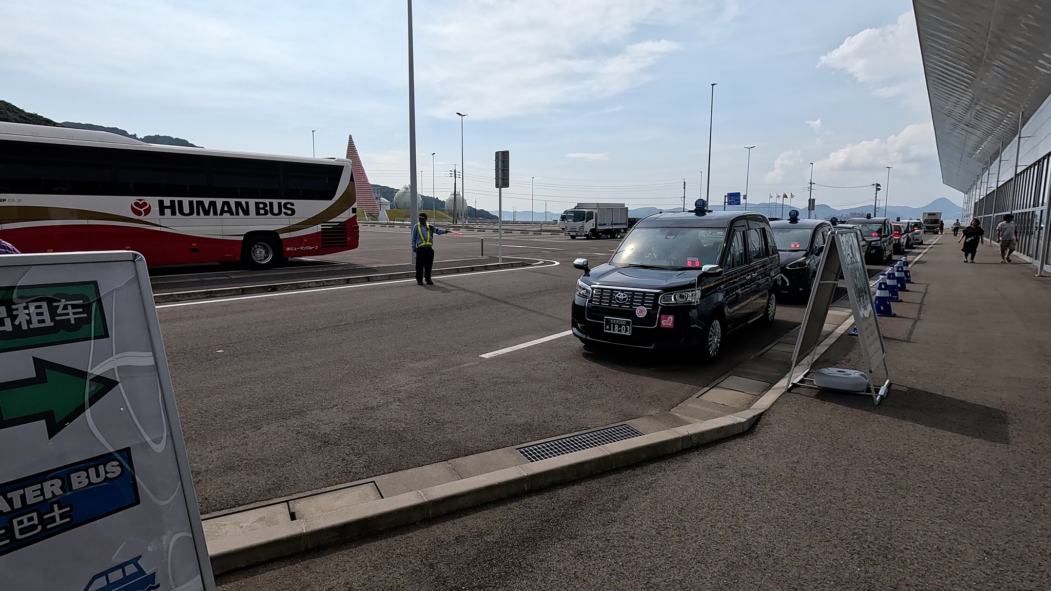 Японские такси чем то напоминают Английские «кебы». А на заднем плане наш автобус.
