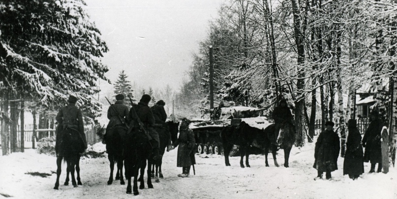 Советский конный патруль возле брошенного немецкого танка Pz.Kpfw. III в деревне Крюково под Москвой (ныне Крюково в черте города Москвы)