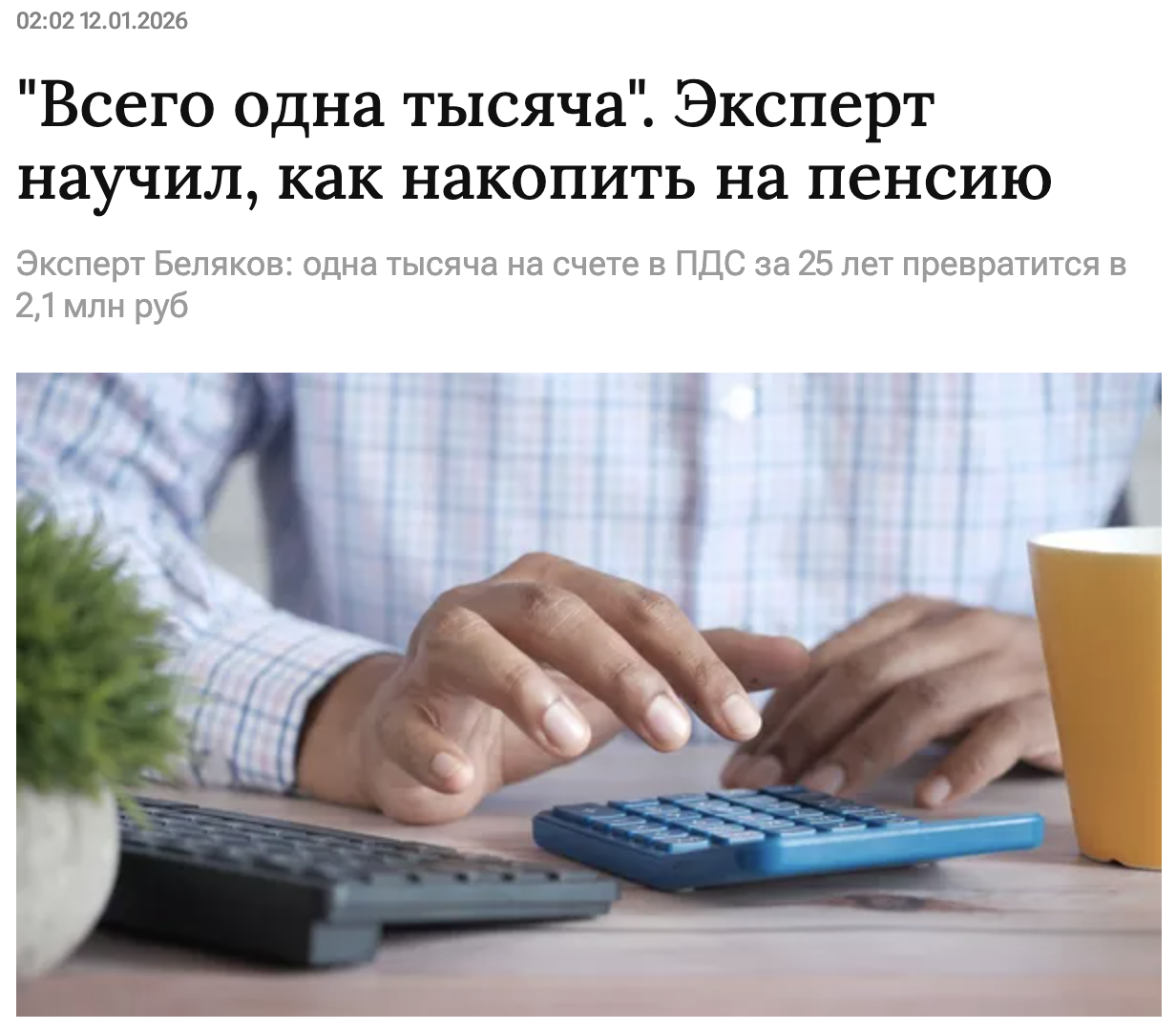 5 hosa Экономика Круто. Жаль только, что эксперт забыл про инфляцию 13 дней назад А с учётом инфляции за 25 лет придётся откладывать примерно на порядок больше. Во что превратятся эти «2,1 млн руб» за 25 лет эксперт умалчивает https://www.gazeta.ru/business/news/2026/01/12/27596893.shtm... Экономика Пенсия Издевательство Ещё 0