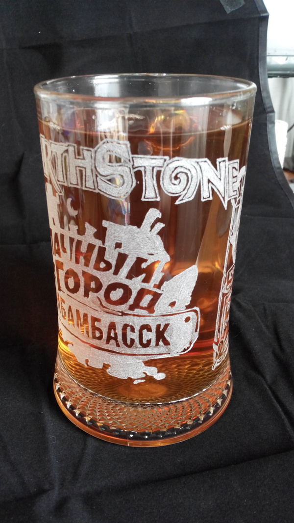 Попытка вставить лист внутрь кружки и отработать таким образом провалилось - толстое стекло и двойная кривизна здорово искажают изображение, поэтому картинку отражаем, распечатываем на лазерном принтере и лепим на поверхность. Промакиваем губкой с цапон-лаком.