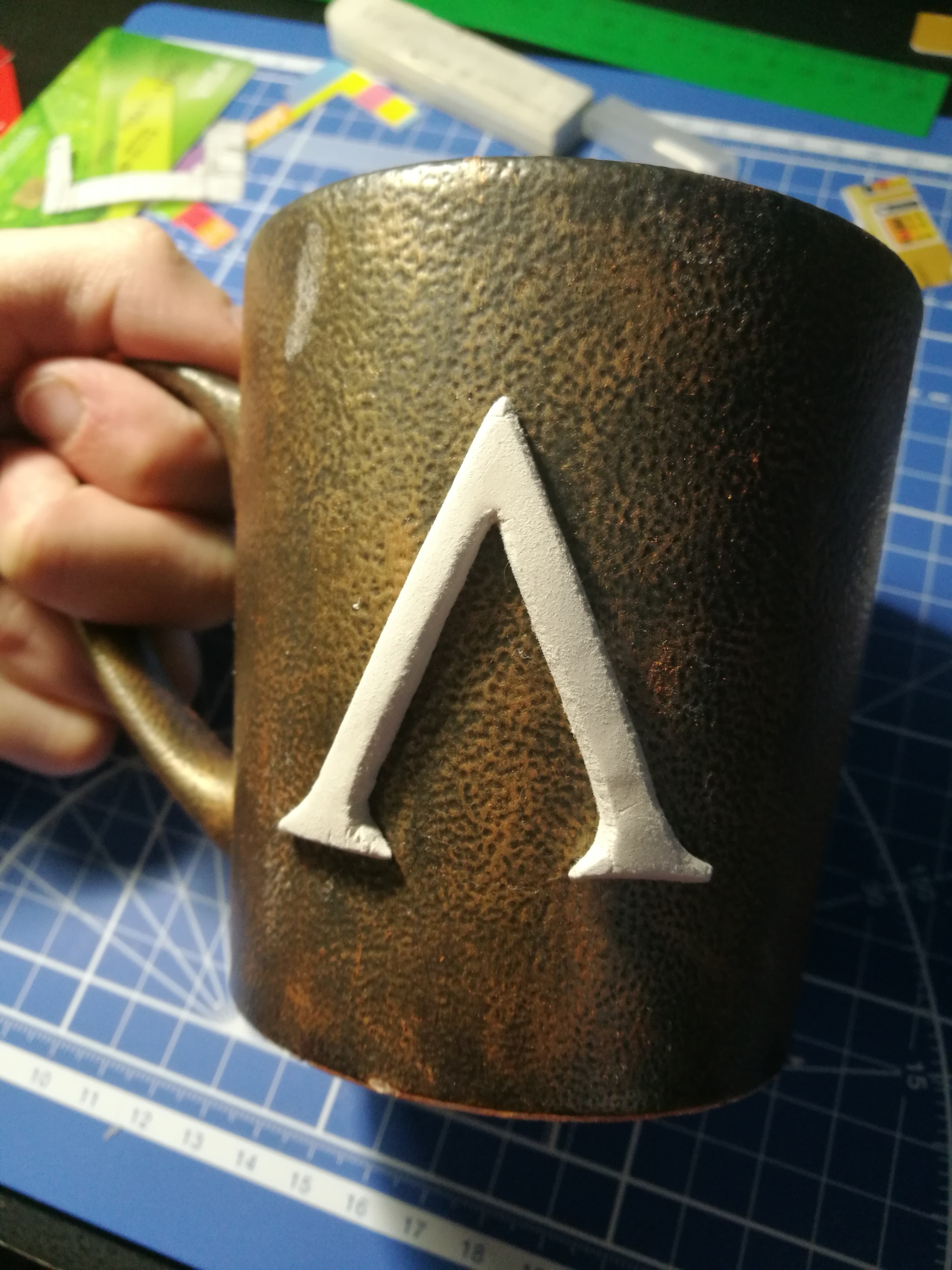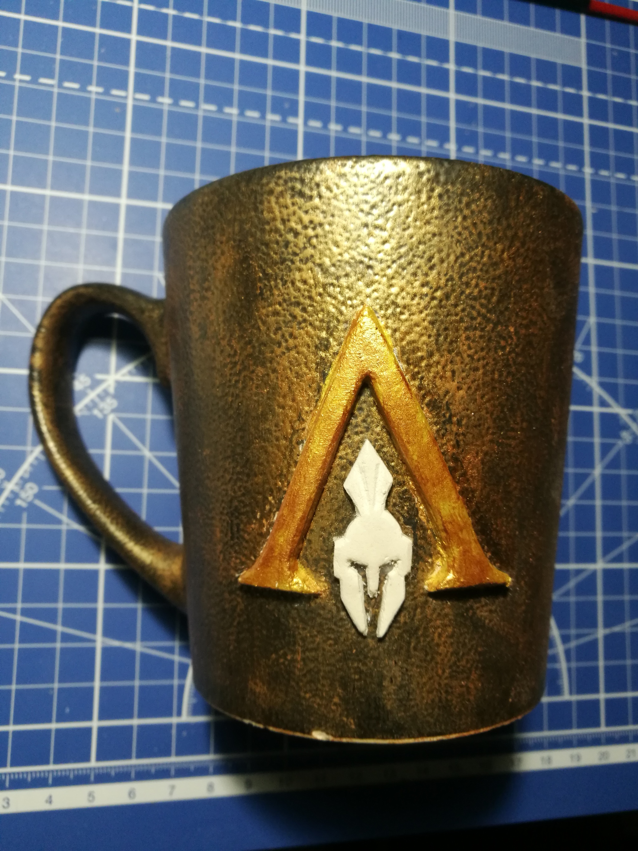 Всем доброго времени суток. Я решил продолжить тему рукоблудства (не, не того рукоблудства)). Я люблю разные самоделки, люблю работать руками и бывает очень увлекаюсь различными тематиками компьютерных игр, фильмов, книг. И случилось так, что я прочно залип в assasins creed odyssey. Да еще и моя любимая Греция на которой я просто помешан. Ну решил чегонито намутить. И в общем вот, первая моя работа в подобной технике. Кружку взял готовую в окее, лого из глины затвердевающей на воздухе, к слову-глина не понравилась, нужна пластика, но уж что было на тот момент. Краски акрил, покрыто все лаком. Поделка чисто по фану, для души, для себя.
