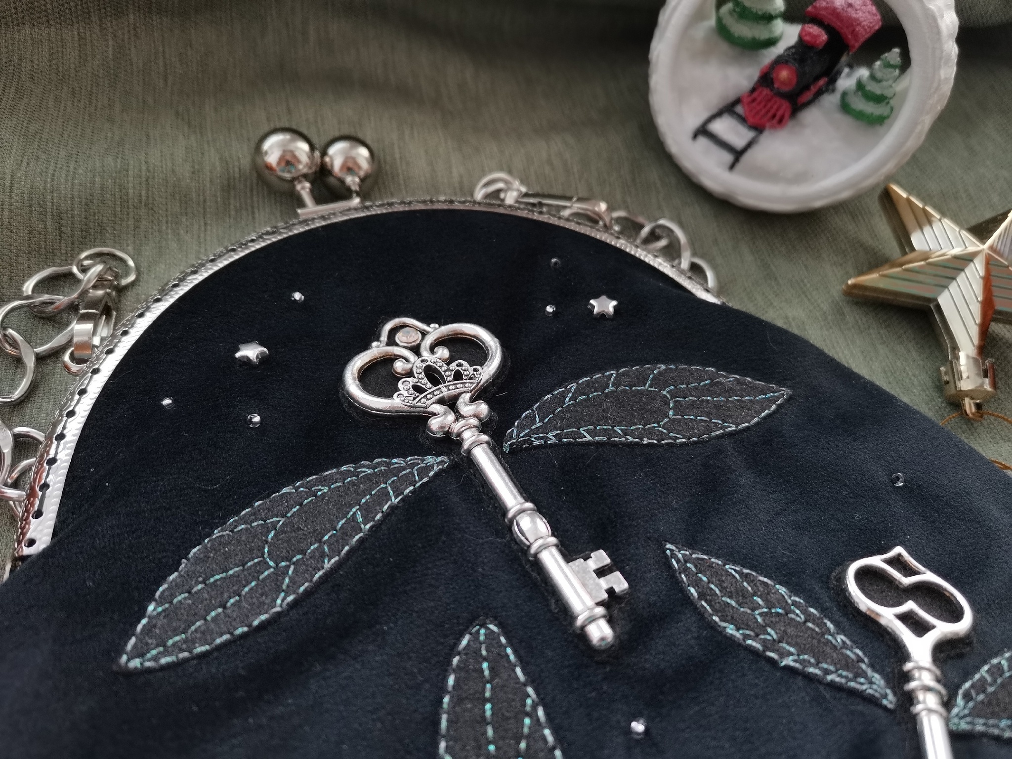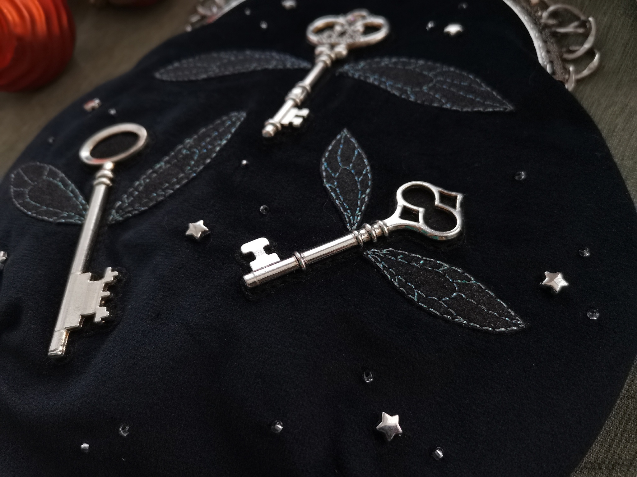 Крылышки вышиты металлизированными нитками на черном фетре. Металлические ключики так же пришиты на фетр прозрачной леской.