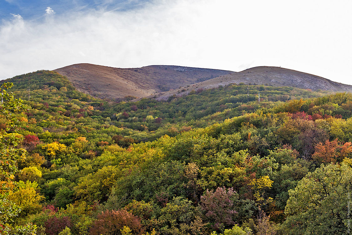 Некоторое время я бродил по округе, спрашивая у местных, по какой из тропинок мне идти. Там довольно много всего натоптано, ну а мне нужна была Ишачья тропа, которая ведёт на нижнее плато Чатыр-Даг. В конце концов я её нашёл и начал забираться в гору. Сначала через приятный такой низкорослый осенний лесок, а потом и по голому склону. Тропа ясная, промаркированная аж пятью видами разных меток, так что если нашёл её, то уже не заблудишься.