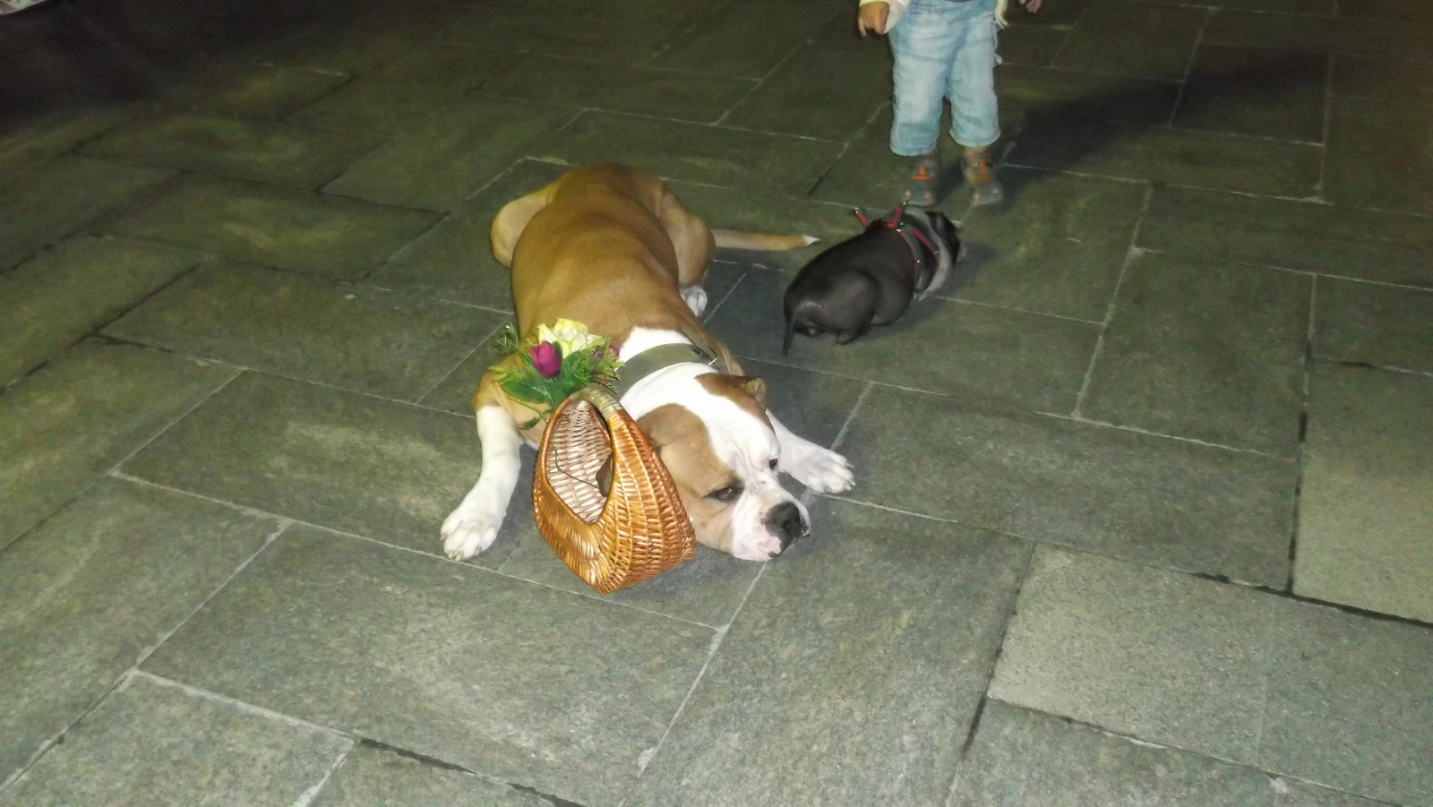 Уставший за день собакен, с другом поросенком. В эту корзинку, держа ее в зубах, пес собирает пожертвования.