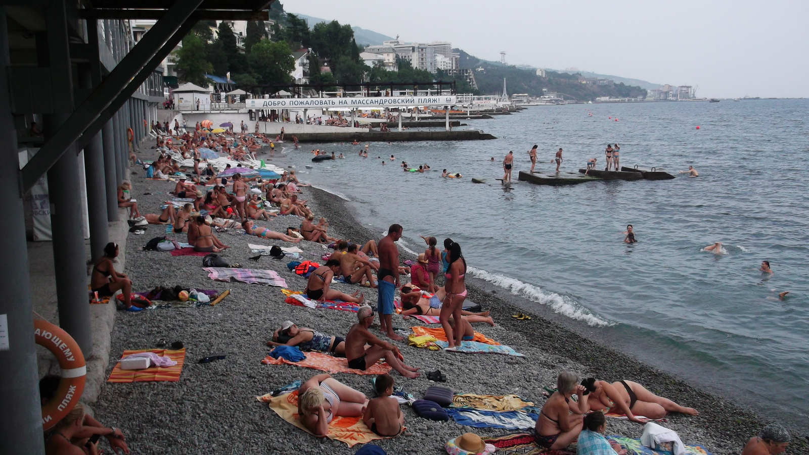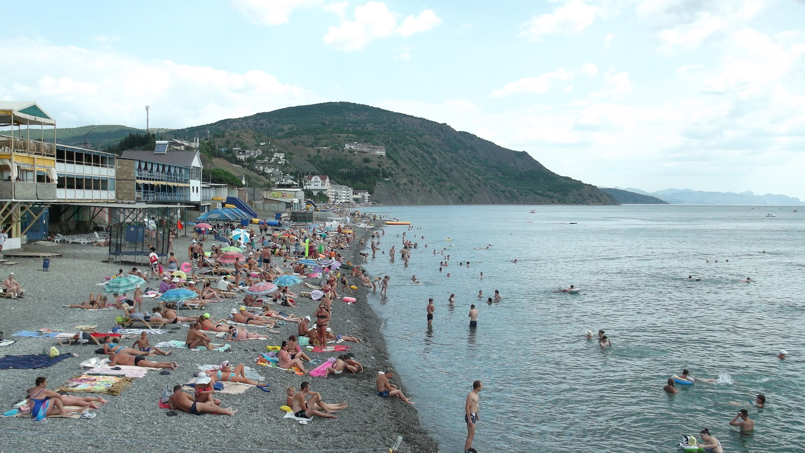 Это уже пляж в поселке Рыбачье. Как видно людей уже побольше. И вообще по моим наблюдениям, с каждым днем народа становилось все больше. По номерам машин можно было сделать заключение, что большинство отдыхающих было из России. Попадались так же машины с Украинскими, Белорусскими и Казахстанскими номерами.
