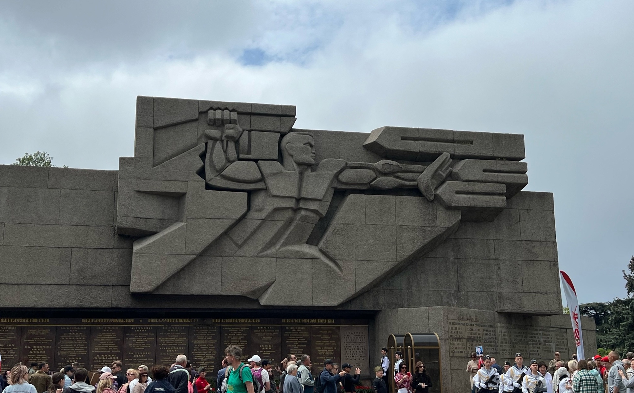 Еще на подъезде в центральную часть Севастополя мы уже увидели огромные колонны автопробега с многочисленными тематическими флагами и знаменами. На Сапун-горе была основательная пробка, а вот в нашу сторону машин было мало. По убранству города и толпам гуляющих было видно, что люди отмечают праздник. Надо сказать, что официальный парад в городе отменили, однако активность общественности в виде многочисленных автопробегов по городу и окрестностям говорила о том, что подобное запретить или зарегулировать гораздо сложнее, чем выкат военной техники по центральной части города.