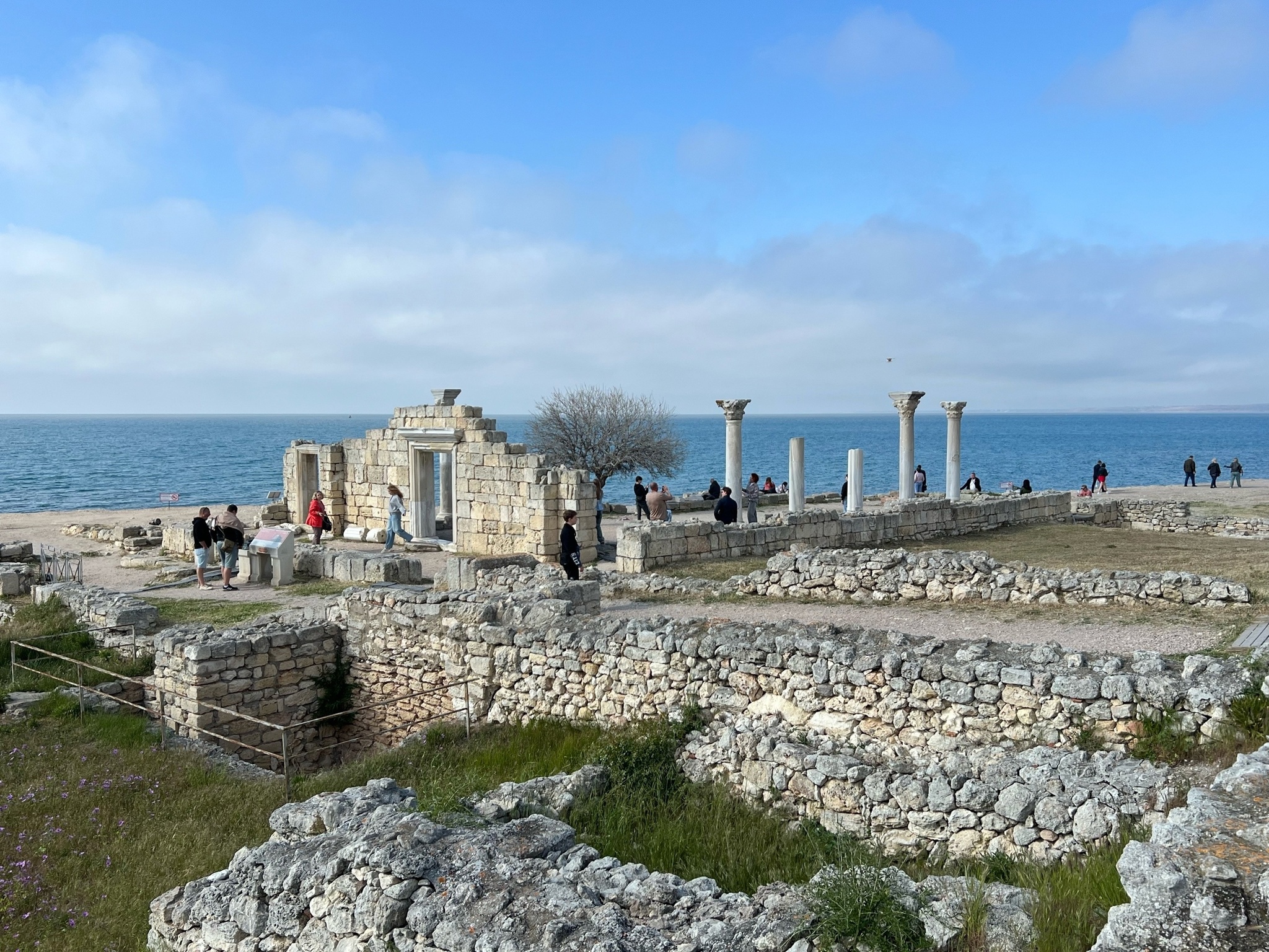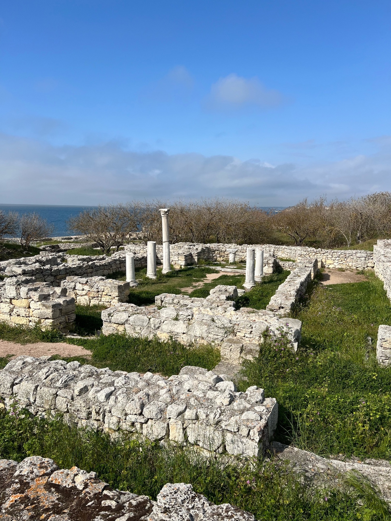 Наконец мы добрались до Херсонеса Таврического, который огорожен от Нового. Как я понял, бродить мне нравится далеко не по всяким руинам, а больше по социалистическим. Поэтому больше любовался пейзажем, чем непосредственно фундаментами зданий, которым несколько тысячелетий. Впрочем, когда появились сохранившиеся колонны базилик 6 века, то я себя почувствовал в настоящей Элладе или Древнем Риме – подобного встречать в России мне еще не приходилось.