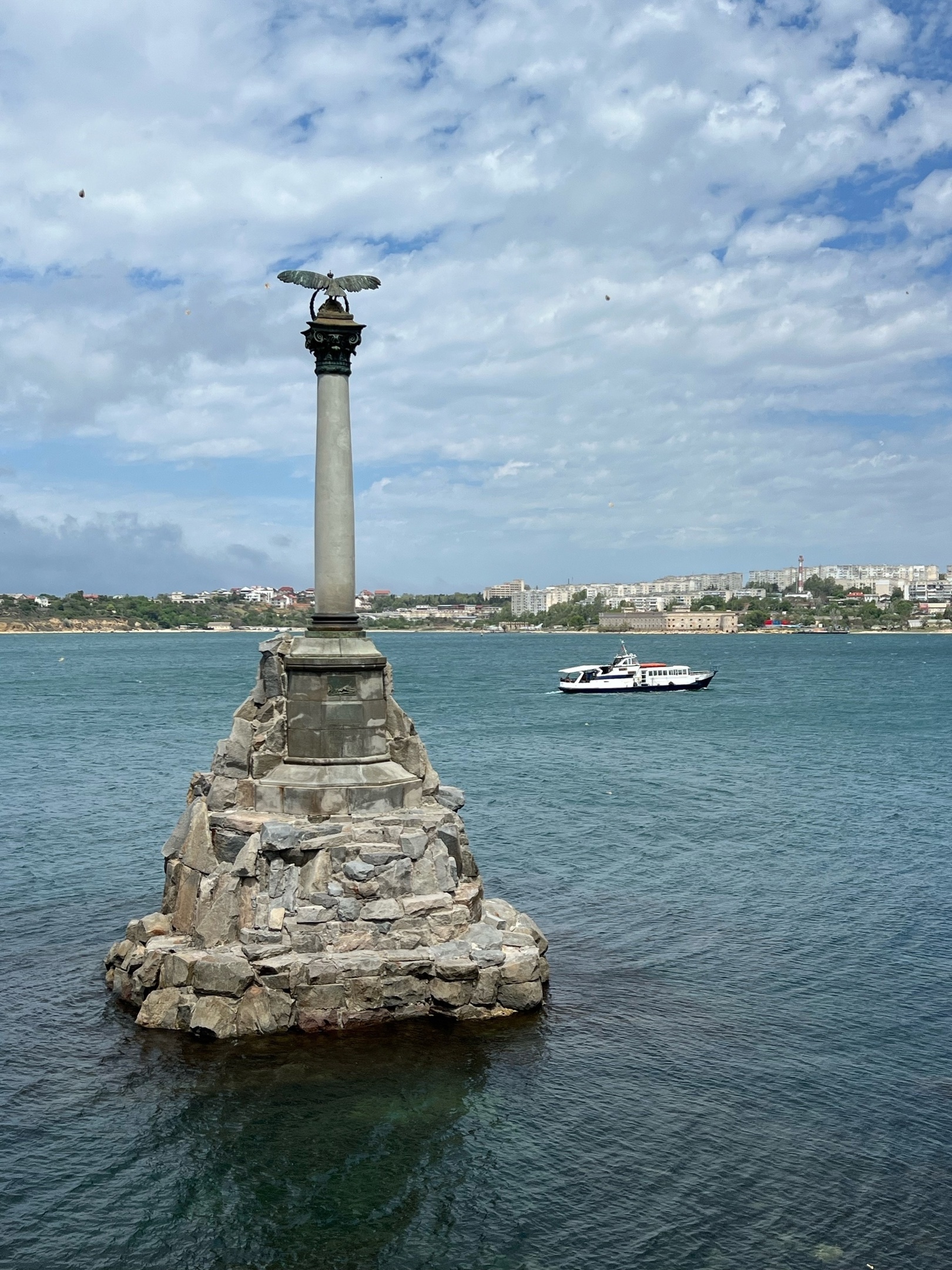 Поскольку ребята сообщили, что смотреть им еще полчаса, я прогулялся в другую сторону по Большой морской – к набережной и памятнику Затопленным кораблям. Мне показалось странным, что мои спутники в целях экономии времени решили не смотреть на символ города, который даже вынесен на флаг и герб субъекта. Сей символ, по сути, воплощение дилеммы вагонетки, которую Нахимов решал в 1855 году – затопить корабли, чтобы не пустить врага в бухту и сохранить город. Монумент поставили в 1905 году и даже во время советской власти лишь сняли крест над головами орлов – а так он стоял неизменным, несмотря на революционное переосмысление истории.