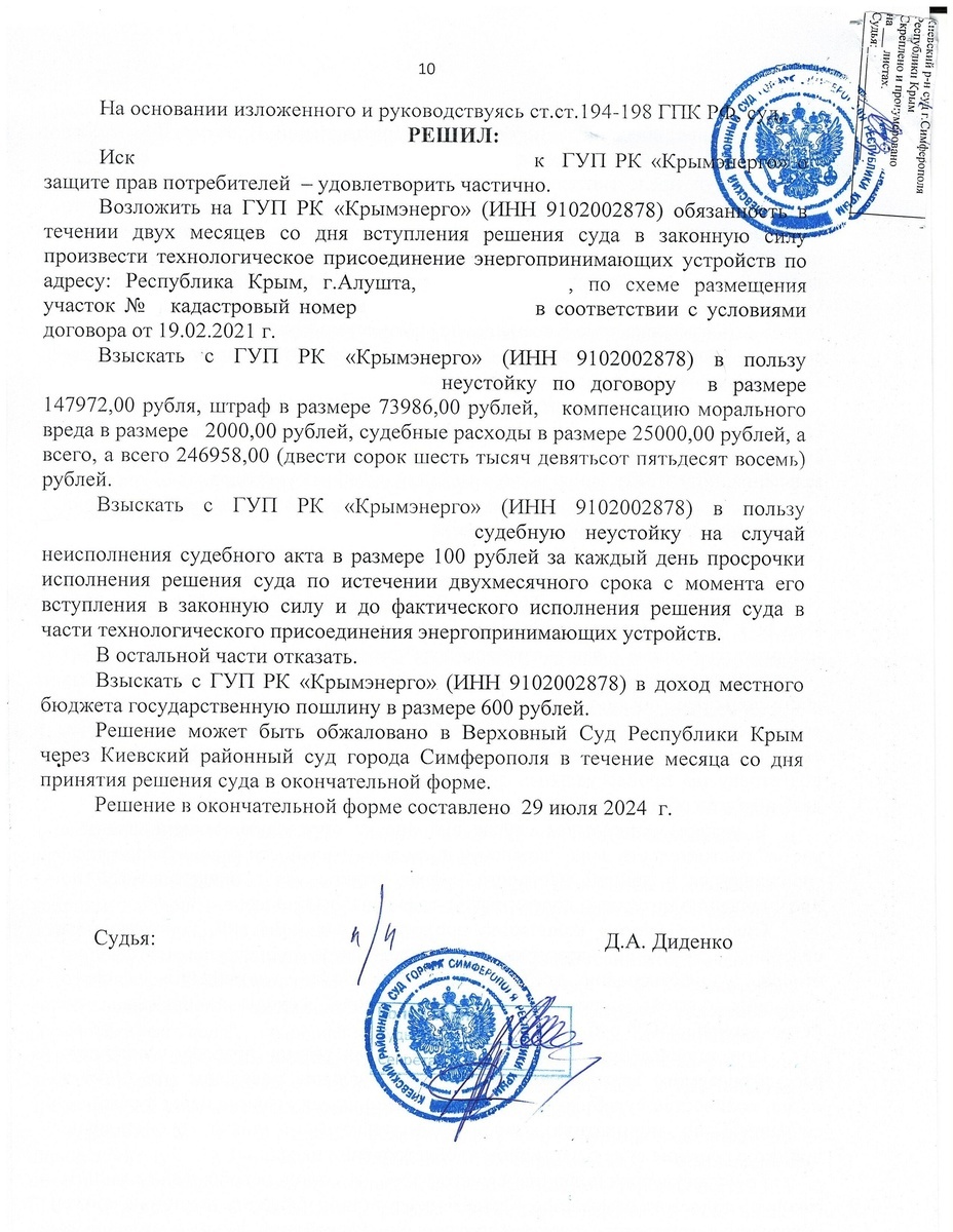 Штраф в размере 50% от удовлетворенной судом суммы, если Крымэнерго отказалось добровольно исполнять ваши требования;