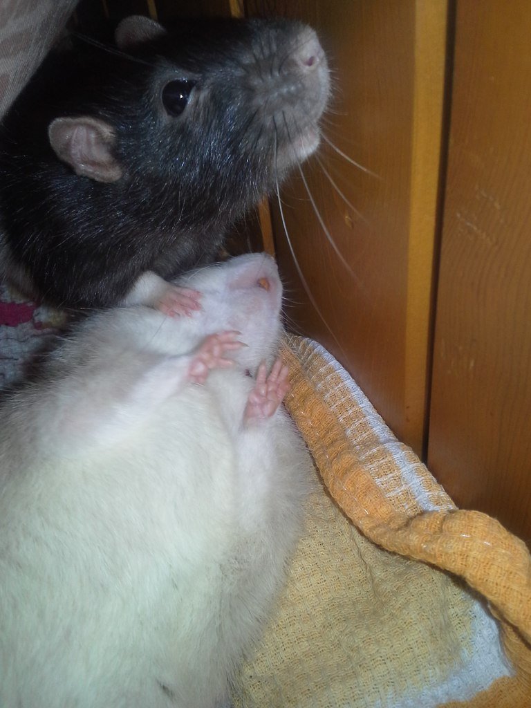 Про девок да, в большинстве случаев они дружат, но между собой время от времени цапаются. Матриархат у них, вот и выясняют, кто главный, особенно если по силам примерно равны друг другу и психологически выявить первенство не выходит. А парни очень-очень дружелюбные, грумят друг друга, играют. Очень позитивные животные и да, очень умные. К человеку относятся отлично, ласковые, на имя откликаются, простенькие команды запоминают даже если их толком не дрессировать. Что-то посложнее уже требует работы, есть такое. А вообще крысы очень индивидуальные. У каждой свой характер и найти двух, которые во всем будут себя вести одинаково, практически невозможно. На картинке крысо-умывашки.