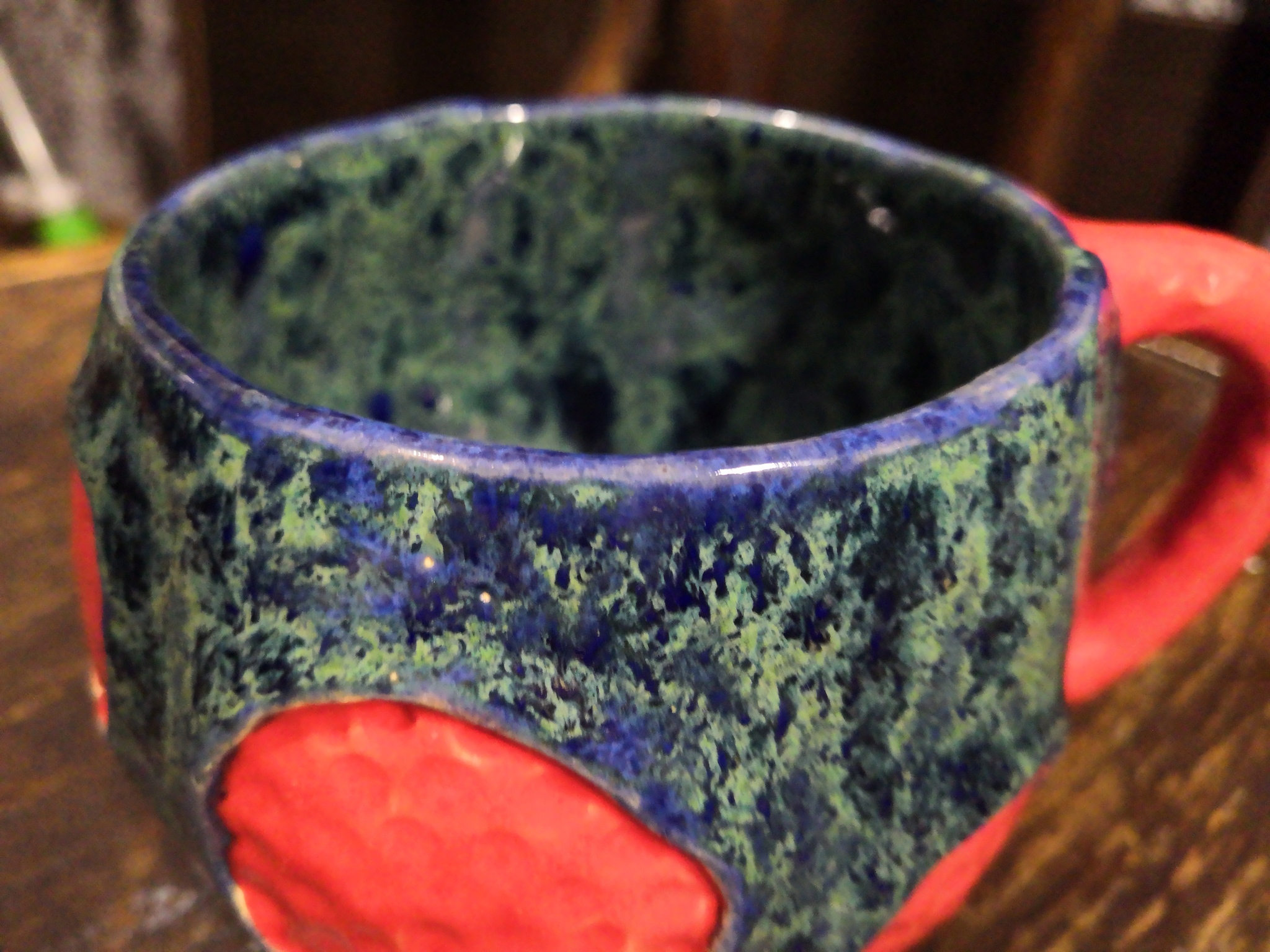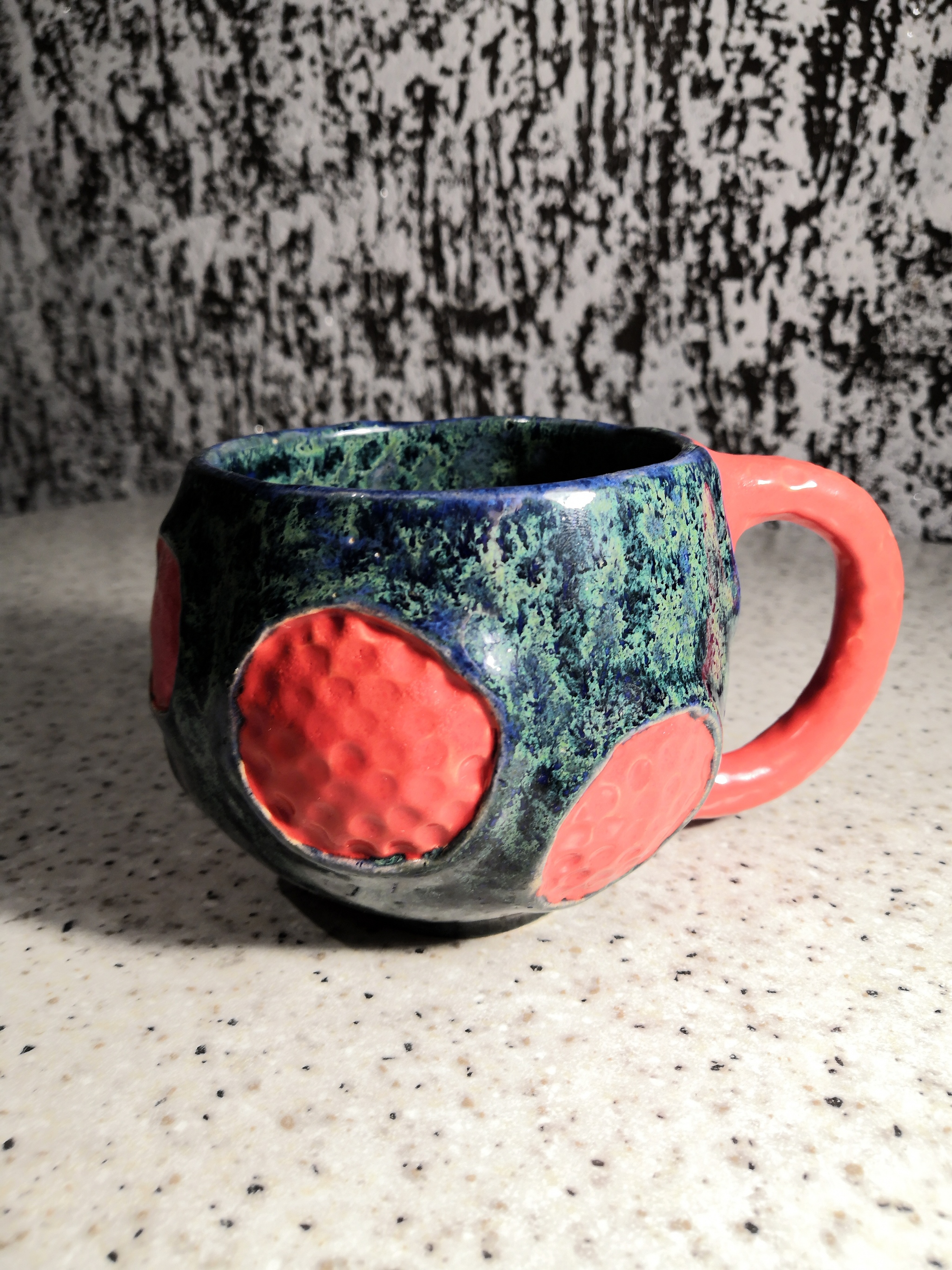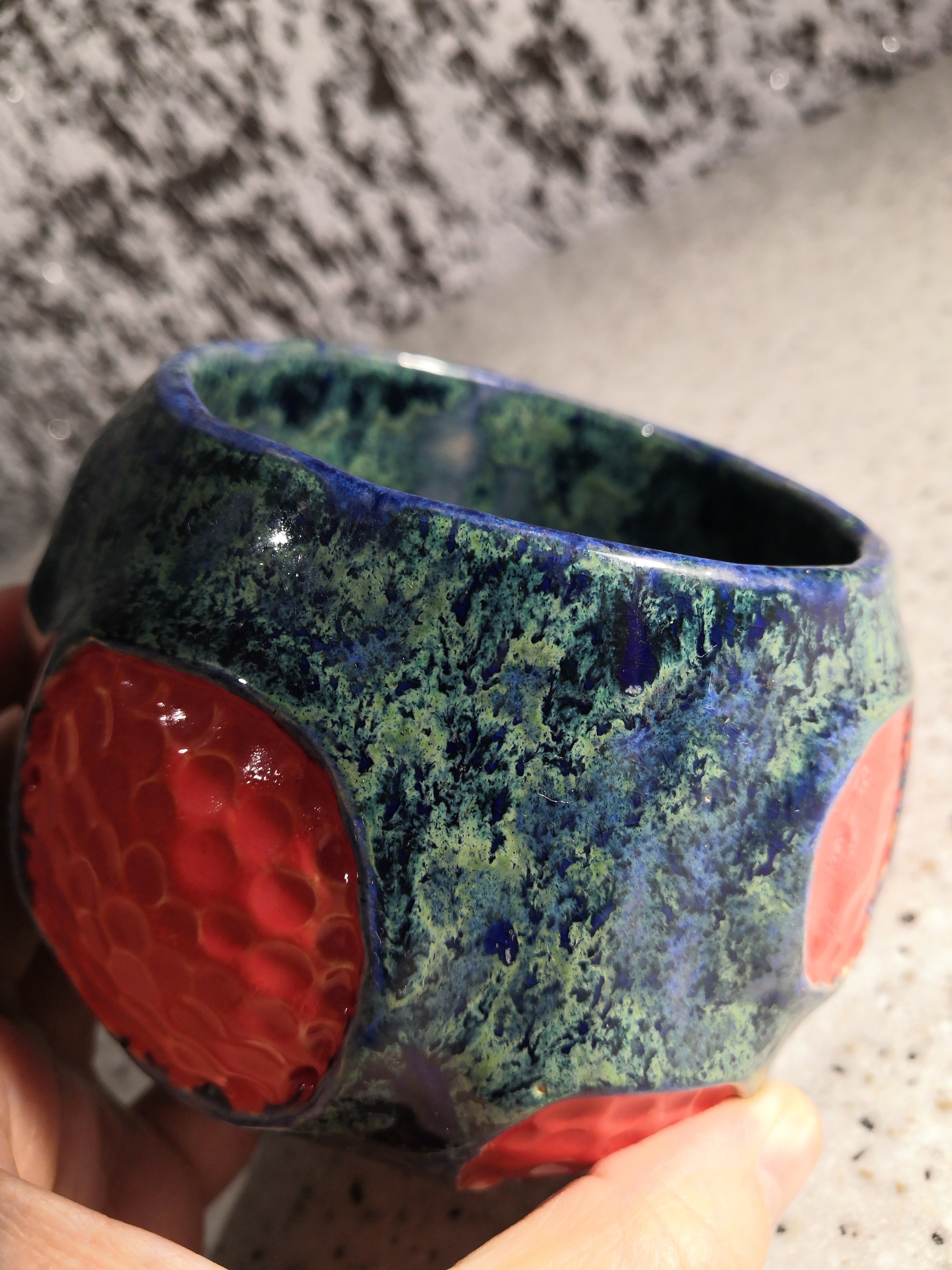 Форма очень простая - обычная руколепная чаша с простой ручкой и дизайном в "моём стиле". С глазурью сложнее, сочетание явно хорошее, но красную глазурь нужно ещё подбирать.
