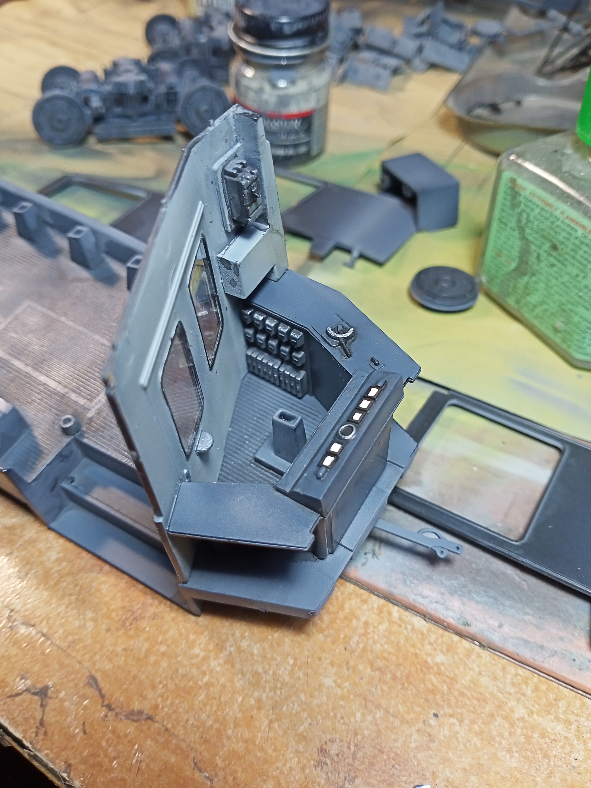 Установлены стёкла, скажу так - не с первого раза. Маскировочной лентой закрыты окна. Двери, кстати, должны быть открывающимися. Надуты серые элементы.