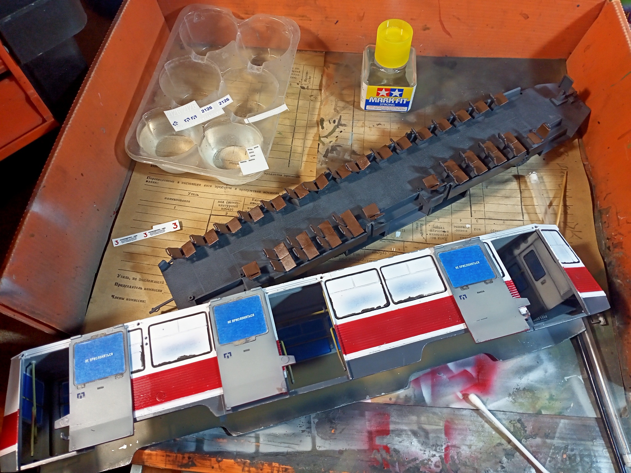О наборе: набор 2021 года от российской фирмы AVD Models (что кстати обозначает "Автомобиль в деталях". Я не знал) в масштабе 1/43. В довольно большой коробке лежат: металлический (Die-Cast) корпус, 7 литников из чёрного ABS-пластика, 2 литника из прозрачного пластика, 6 болтов, 4 металлические оси, одна фототравлёная деталь, самоклейка для зеркал, декаль и инструкция. На чёрных литниках деталей немного - 95 штук, ещё 30 на прозрачных. Неиспользованными останутся около 10 штук. Качество литья ниже среднего: есть облой, утяжины, следы толкателей и половин форм. Пластик мне не очень понравился - он не слишком хорошо клеится обычным модельным клеем (да, знаю, есть специальный клей для ABS-пластика), также не очень хорошо обрабатывается. Однако он эластичнее и прочнее на излом полистирола. Металлический корпус отлит неплохо (насколько я могу судить, впервые работая с таким набором) - рифление на бортах, технологические лючки, рёбра жёсткости на крыше; однако имеет дефекты в виде зазубрин и заусенцев на гранях, к тому же в коробке был деформирован (выровнять его не составило труда). Детализация наверное неплохая для своего масштаба: хорошо показан интерьер салона и кабины, неплохо проработаны тележки и токоприёмник. Пол салона имеет неплохо показанную расшивкой фактуру резинового пола. Стыкуемость не слишком хороша, детали требуют подгонки и склеивания под давлением. Часть соединений болтовые, так крепятся тележки к днищу и само днище к металлическому корпусу. Колёса закрепляются на металлических осях, очевидно чтобы выдерживать солидный вес модели. Прозрачные детали по качеству неплохие (тонкие, чистые), но стыкуются с корпусом совсем не идеально. Из фототравления выполнен один элемент - дворник, и его вполне можно было отлить и из пластика без потерь. Набор не имеет вариативности по сборке. В наборе нет бонусов (хотя подставочка в виде рельс не помешала бы), но производитель дал некоторые мелкие детали с запасом - фары, габариты, зеркала заднего вида и колесо. Инструкция - ерунда, халтура и головотяпство со взломом. Рисунки мелкие, неудобные. Порядок сборки непрактичен, если вы планируете окрашивать модель. Хотя окрашивание производителем как будто и не подразумевается - схем окраски попросту нет! Не указано ни одного цвета ни интерьера, ни экстерьера, чёрно-белый чертёжик трамвая с шести проекций в конце инструкции не имеет указаний ни по окраске, ни по размещению декалей. Хоть это и нигде не указано, но предлагается один вариант - красно-белый корпус с белыми дверями с синими логотипами на них, то есть не совсем стандартный вариант окраса, не такой, как на бокс-арте. Декаль хорошая, яркая, тонкая, также имеет запас по некоторым элементам. В целом набор от AVD мне не понравился. Да, он лучше того, чего я ожидал и явно не входит в раздел модельного треша (меня пугали ужасным литьём и стыкуемостью, перепутанными литниками от других наборов). Но скажу честно - я не хочу снова работать с этой фирмой, особенно с более старыми наборами, которые неизбежно будут хуже. Плохая инструкция, странный пластик, громоздкий и неудобный в работе металлический корпус привили мне антипатию к фирме. Я понимаю, что у многих моделей от AVD попросту нет альтернатив, но благо меня автомобили в масштабе 1/43 не интересуют. Цена, кстати, у набора очень немалая - на уровне классного танка в 1/35 от китайс
