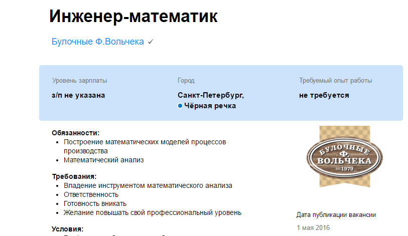 8 jovowitch Кто говорил, что матан никогда не пригодится? 9 лет назад Вакансия-мечта, математик в булочную. Объявление Математика
