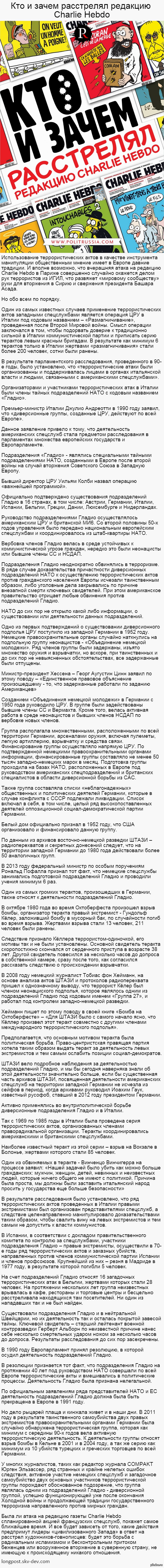 327 Ortodox1 10 лет назад Кто и зачем расстрелял редакцию Charlie Hebdo. Использование террористических актов в качестве инструмента манипуляции общественным мнение имеет в Европе давние традиции. Франция Европа Сирия СССР США Германия НАТО Политика Charlie Hebdo Длиннопост